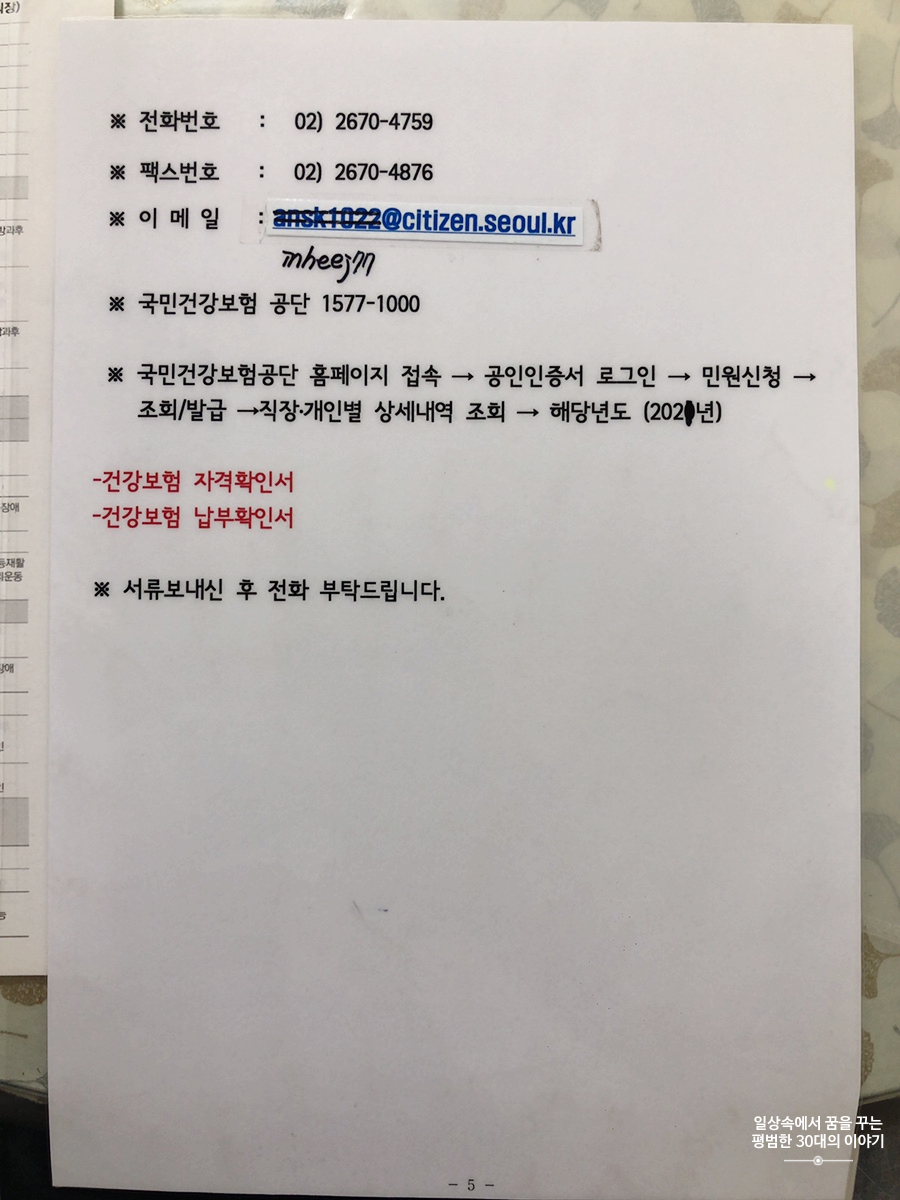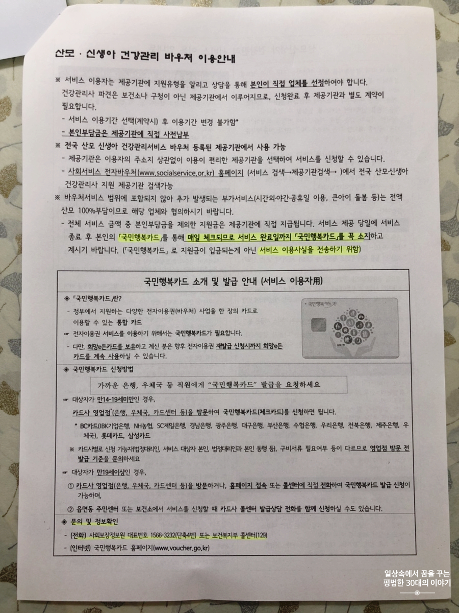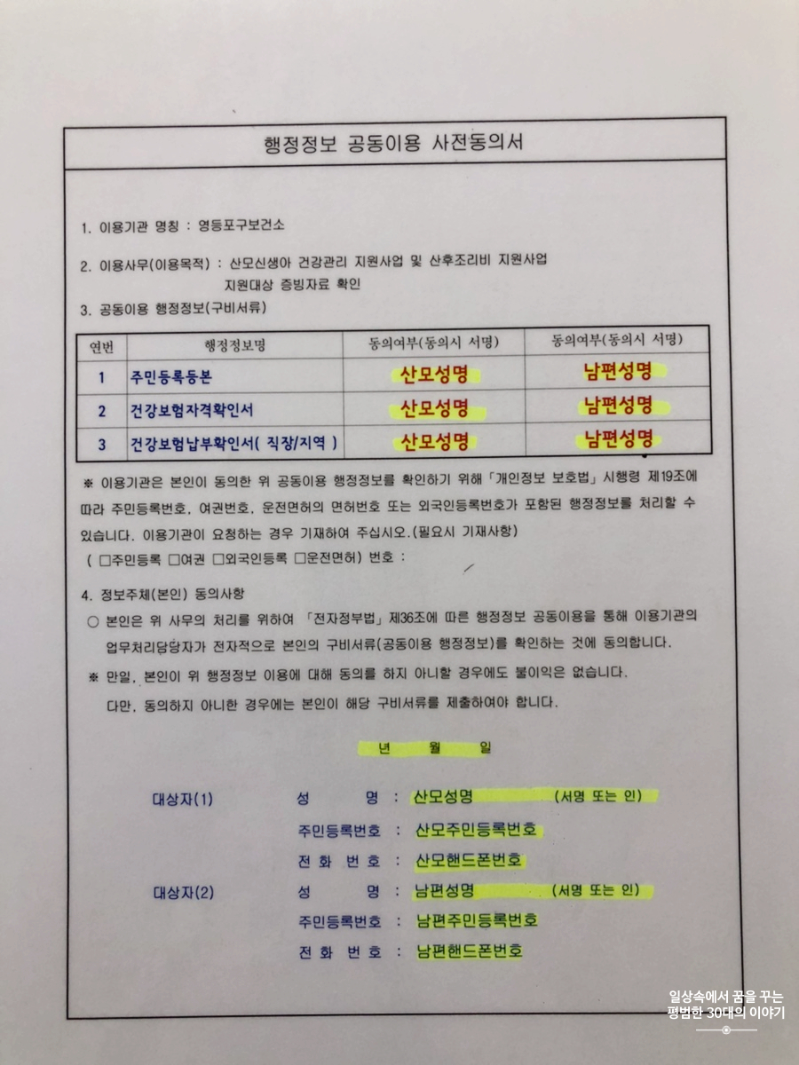 보통은 구비서류로 부부 각 각의 신분증과 임신확인서만 준비해 가면 되는데 우리는 국제부부라서 남편(외국인)의 건강보험을 이곳에서 조회할 수 없다고 하여 해당 년의 건강보험 자격 확인서(건강보험 자격득실 확인서가 아님), 해당 년의 건강보험 납부확인서를 직접 인쇄해 제출하거나 이메일로 전송하거나 해야 한다. 나는 다행히 노트북을 가져가서 건강보험관리공단 웹사이트에서 서류를 PDF 파일로 발급받은 뒤, 산후도우미 담당자분께 이메일로 전송하였다.