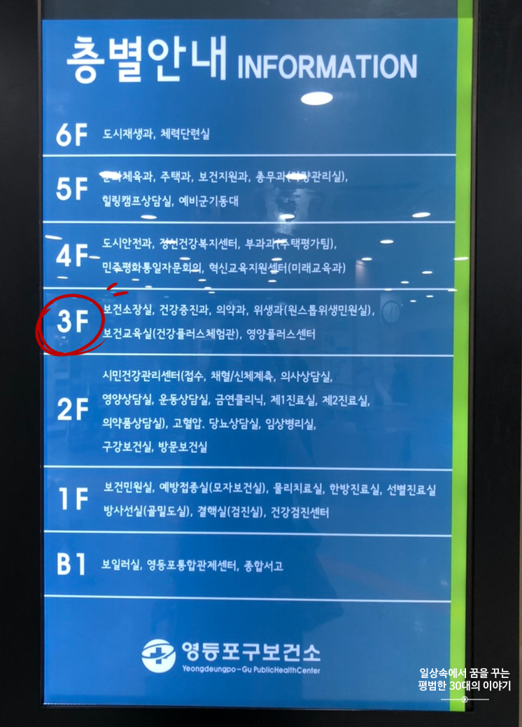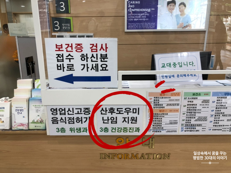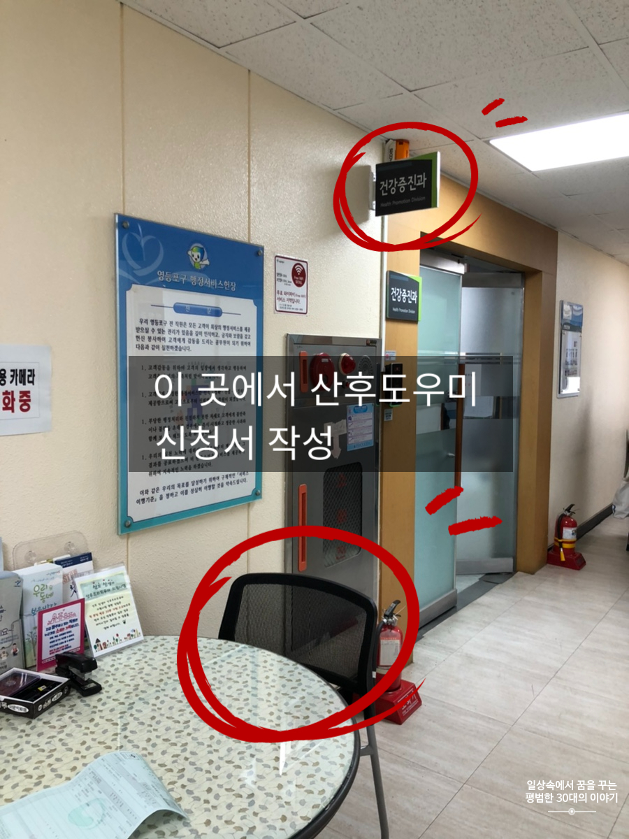 출산 예정일을 40일 앞두고 산후 도우미를 신청하기 위해 거주지 관할 보건소인 영등포 보건소를 방문했다. 영등포 보건소는 영등포구청 뒤편에 위치해 있어 찾기 어렵지 않다. 산후 도우미를 관할하는 곳은 영등포구 보건소 3층에 있는 건강증진과로 엘리베이터에서 내리면 바로 보이는 위생민원실을 바라보고 왼쪽으로 직진 후, 오른쪽으로 직직하면 복도 맨 끝 안쪽에 위치해있다. 한 층이 그다지 넓지 않기 때문에 헤맨다 하더라도 금방 찾을 수 있다.