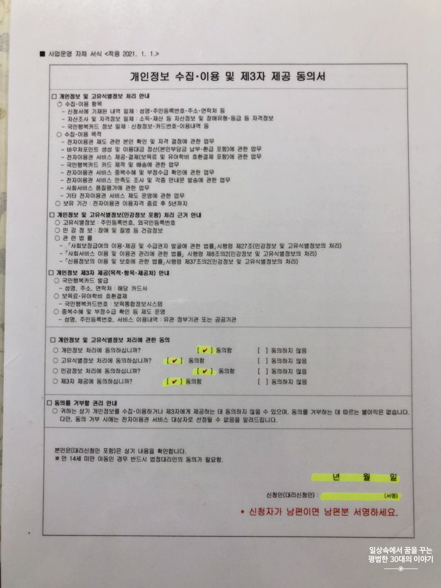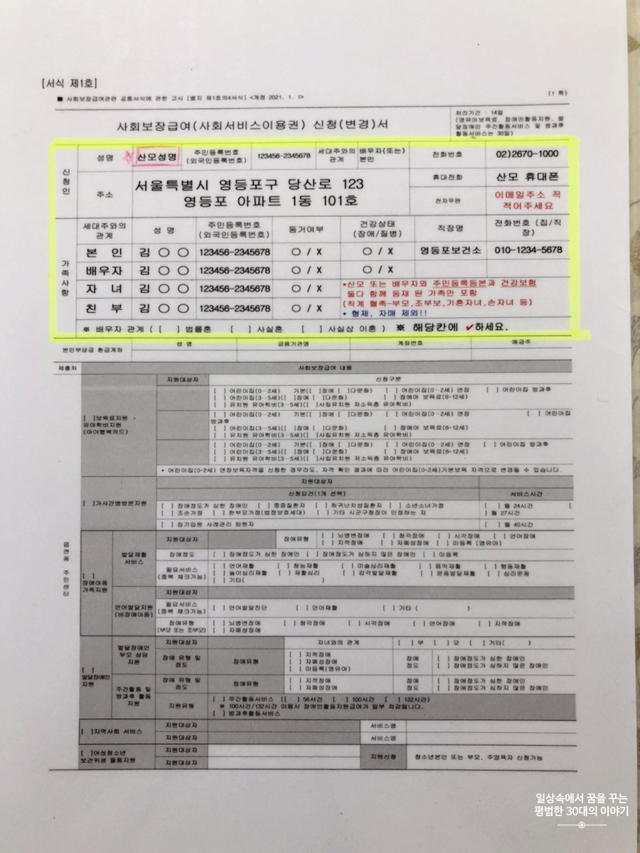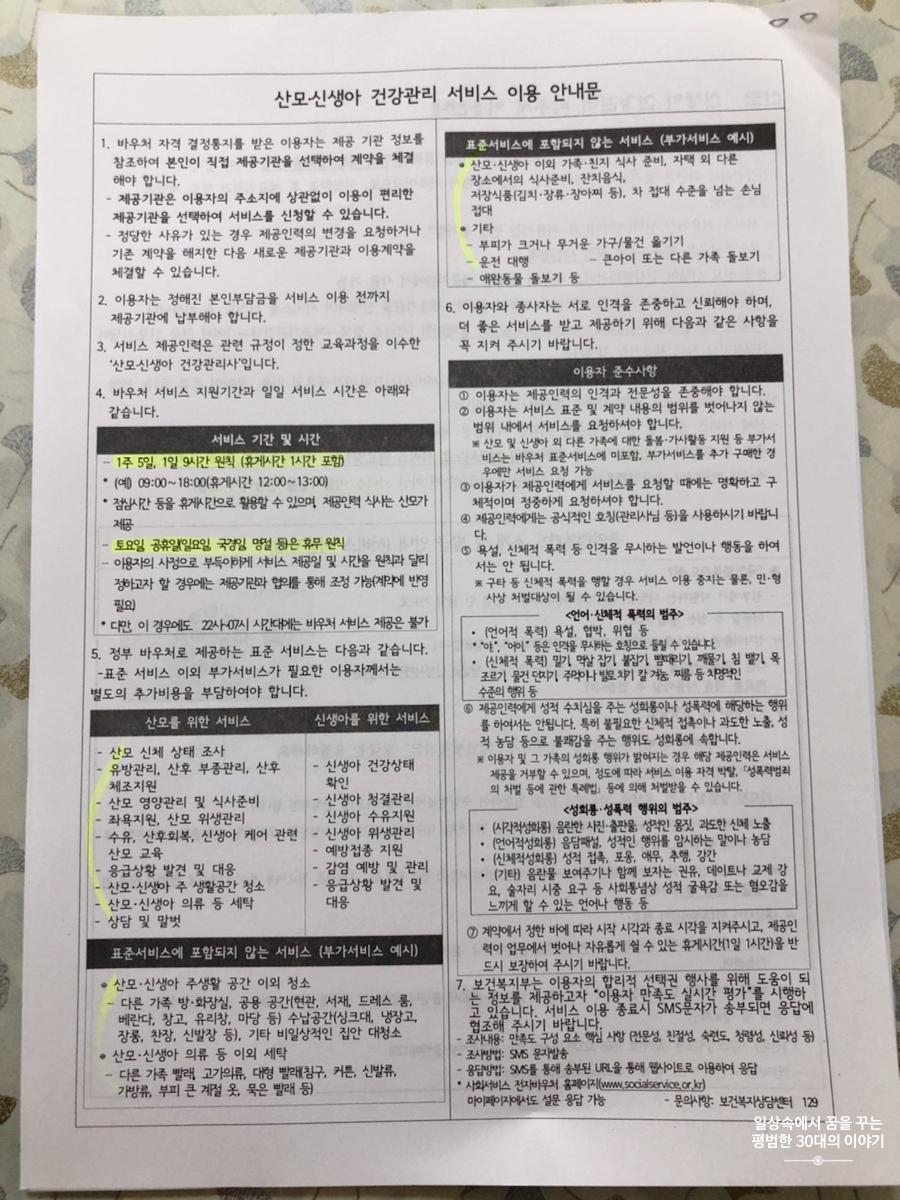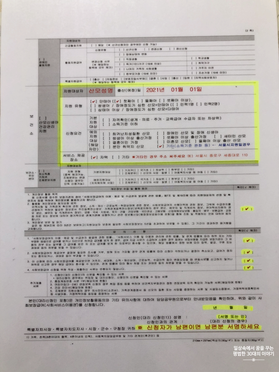 복도 맨 끝 안쪽에 위치한 건강증진과에 어떤 용무로 온 지 말하고 나면 그 앞에 놓인 두 개의 테이블에서 산후도우미 신청서를 작성하면 된다. 작성방법 매뉴얼이 적힌 코팅 용지를 주시는데 그대로 따라서 작성하기만 하면 된다.