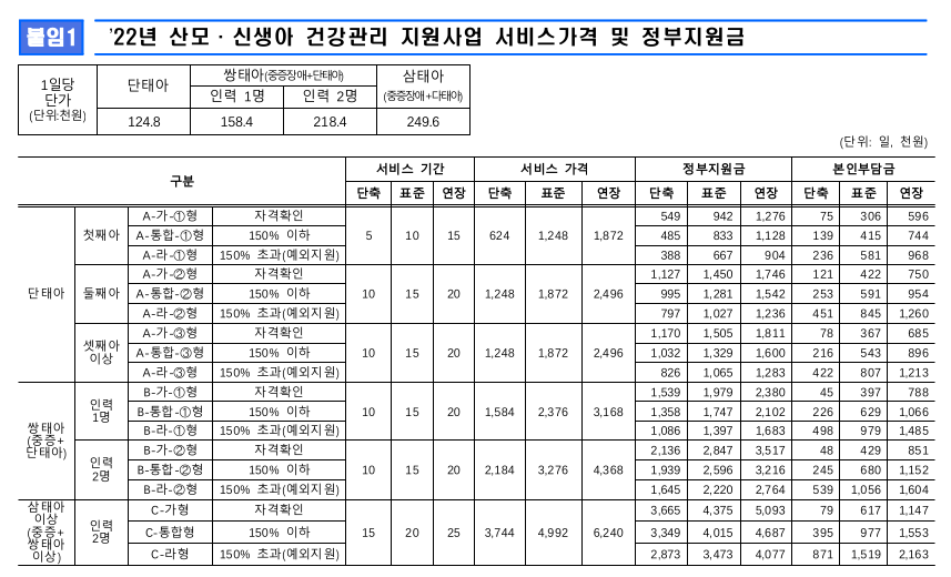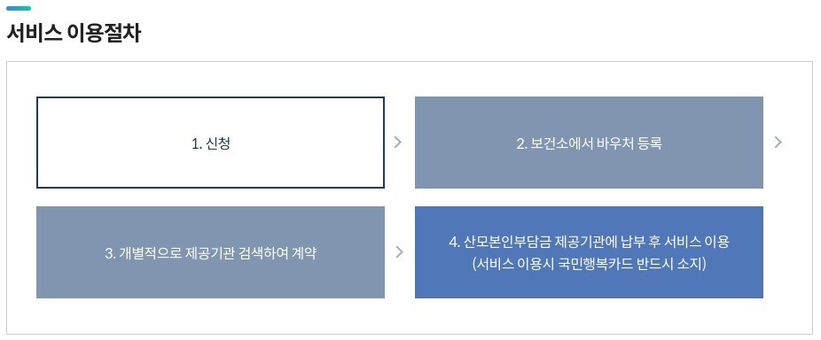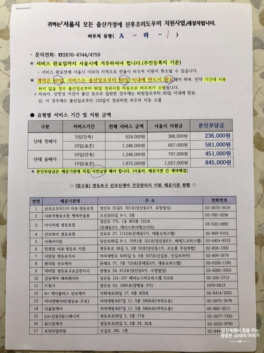 - 특이 사항: 서비스 완료일까지 서울시에 거주해야 함(주민등록지 기준) / 계약은 60일, 서비스는 출산일로부터 90일 이내에 반드시 완료해야 함, 본인 부담금은 제공 기관에 사전 납부해야 함, 서비스를 제공하는 기간 동안 국민행복카드를 통해 서비스 이용 여부가 체크되므로 서비스 완료일까지 꼭 국민행복카드를 소지하고 있어야 함