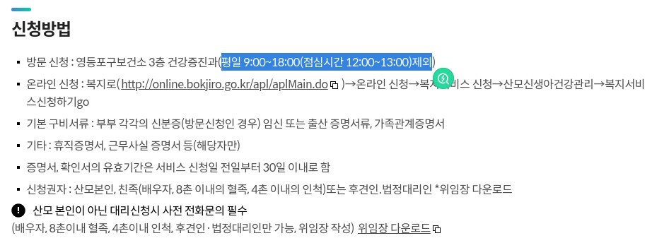 - 신청 장소: 오프라인 - 영등포구 보건소 3층 건강증진과 (평일 9:00~18:00 / 점심시간 12:00~13:00 제외) / 온라인 - 복지로