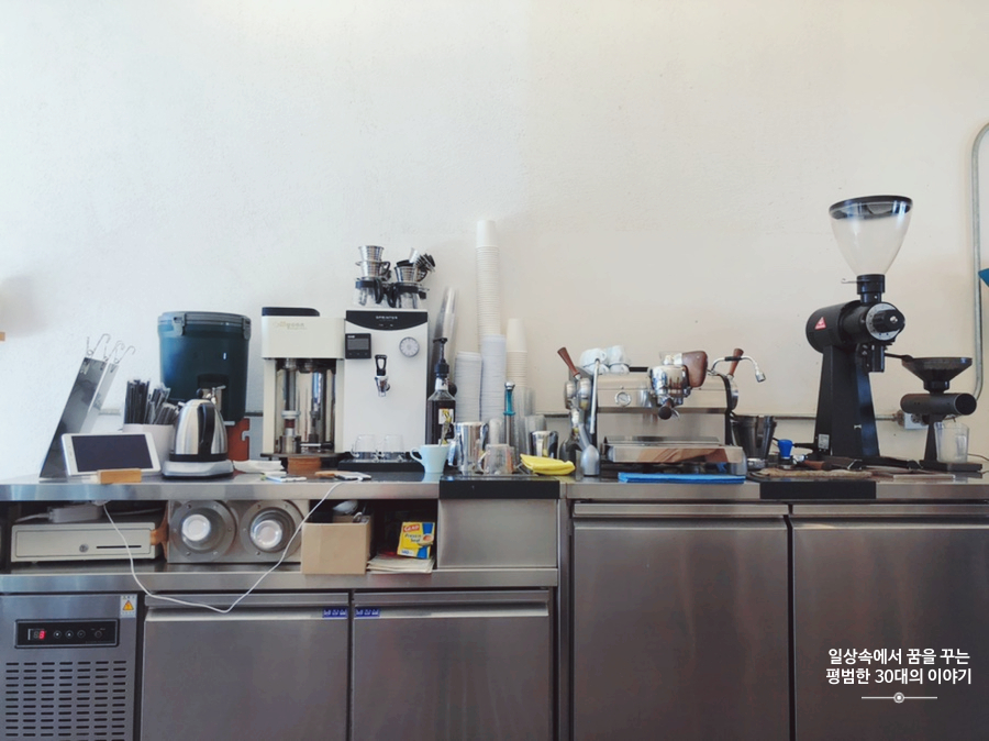 정말 더 도말도 덜도 말고 카페 운영에 필요한 것들로만 알차게 구성되어 있어 인테리어에 군더더기가 없다. 그리고 신기하게 이곳은 1구짜리 머신을 사용한다. 공간이 그다지 넓지 않아 좌석이 많지 않은 게 조금 아쉽다면 아쉬운 점!