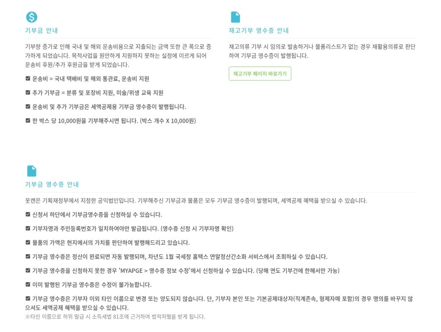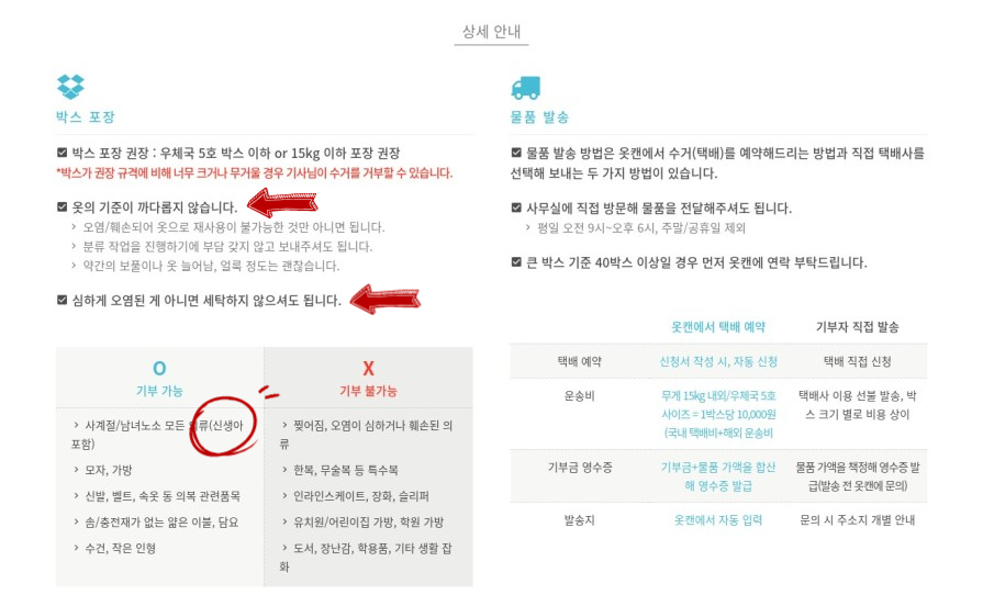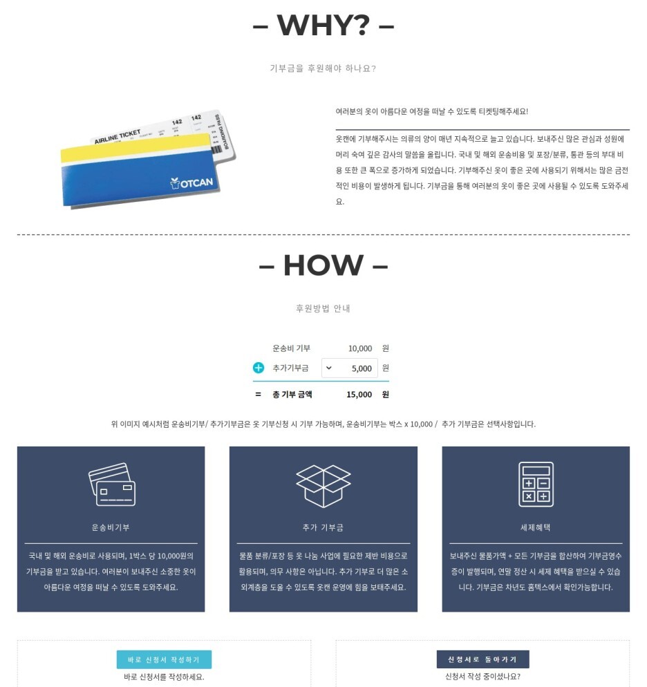 우연히 알게 된 옷캔. 운영방식은 아름다운 가게나 굿윌스토어와 비슷하다. 다른 점이 있다면 기증할 물품을 보낼 때, 기부금을 한 박스당 10,000원 이상 지불해야 한다는 점이다.(직접 방문하여 기증하는 경우는 어떤지 모르겠다) 이 이유는 명확히 옷캔 웹사이트에 기재되어 있는데 기부량 증가로 인해 국내 및 해외 운송비용으로 지출되는 금액 또한 큰 폭으로 증가하게 되어 목적 사업을 원만하게 지원하기 위해 기부금을 받게 되었다는 것이다. 기증자가 지불하게 되는 기부금은 총 두 가지로 운송비와 추가 기부금이 있다. 추가 기부금은 선택 사항이므로 원하지 않는다면 지불하지 않아도 되나 운송비는 무조건 지불해야 한다. 이 운송비는 국내 택배비 및 해외 통관료, 운송비로 사용된다. 개인적으로는 충분히 이해가 되는 부분이다. 물론 기증하는 사람 중 일부는 좋은 마음으로 기증을 하는데 한 박스당 10,000원을 지불하라니 황당해할지도 모르겠지만 나는 여러 가지 봉사활동을 해봤었고 옆에서 이러한 기관들이 어떻게 운영되는지 지켜본 경험이 있기 때문에 충분히 이해가 된다. 기증하는 사람은 기증하고 나면 그만이지만 기관 입장에서는 전국에서 들어오는 수많은 물품을 분류하고 깨끗하게 세척 혹은 세탁하고 정리하여 필요한 곳에 보내는 것까지 그 과정이 상당히 많고 손이 많이 갈 뿐만 아니라 돈도 많이 든다. 그렇기 때문에 정부의 지원이나 개인 후원 등이 없다면 기증 물품만 가지고는 기관을 운영하기 힘들다.