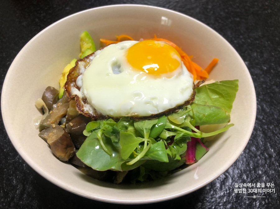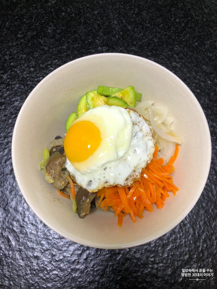 비빔밥 - 당근, 양파, 가지, 호박, 야채, 계란, 참기름, 고추장