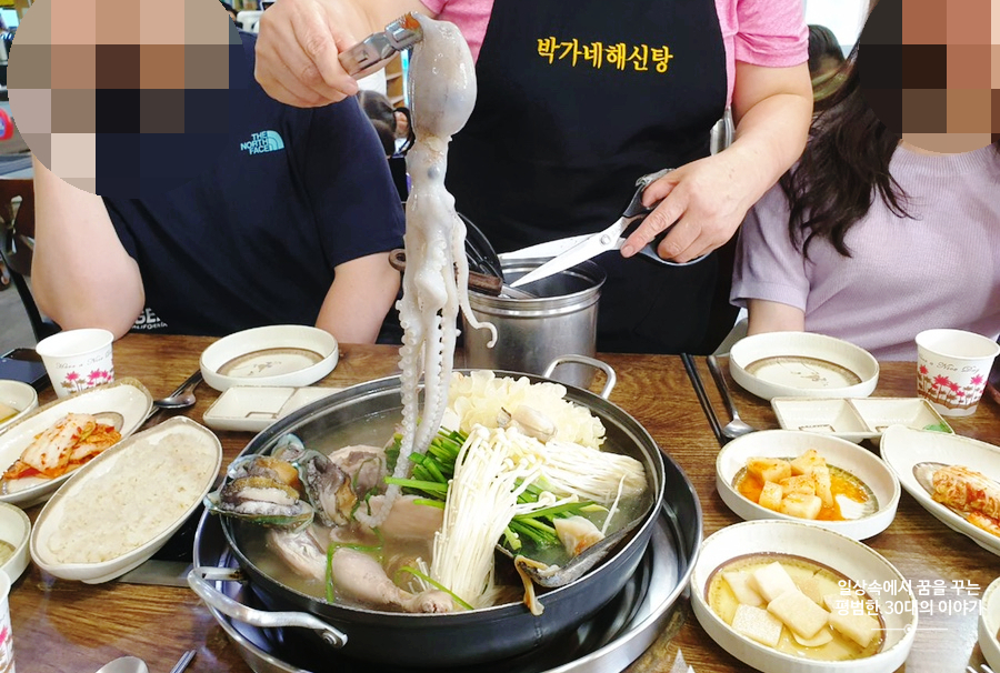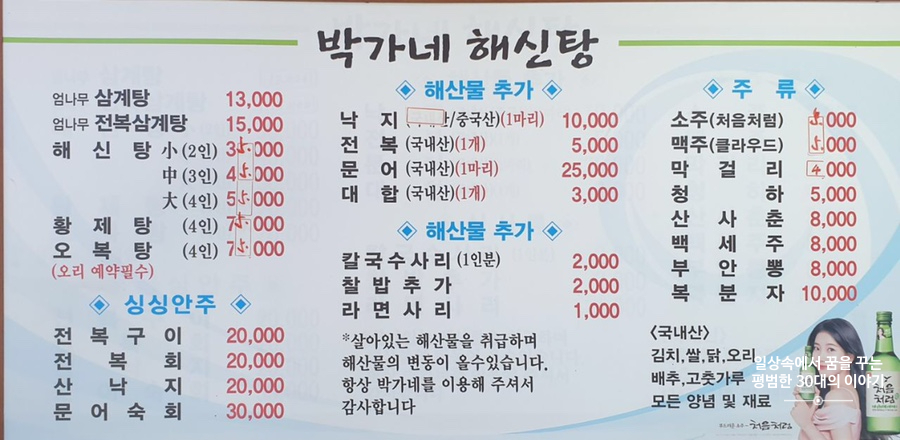 ㅂ 몇 주 전부터 먹고 싶어서 노래를 부르던 해신탕! 그런 내가 안타까워 보였는지 남동생이 주말에 시간을 내서 데려가 줬다. 나는 뚜벅이 족이기 때문에 해신탕을 먹기 위해 안양까지 가기에는 조금 어려움이 있어서 못 가고 있었기 때문이다. 고마워 동생~ 이럴 때만 가족이 최고! 박가네 해신탕은 남동생이 알려줘서 가족 식사를 하러 몇 번 방문한 적이 있는데 갈 때마다 무척 만족했던 곳이다. 이번에는 정말 오랜만에 방문한 거였는데 가격에 변동이 있더라. 그래도 해신탕 치고 가격이 비싼 편은 아니다.(요즘은 삼계탕 한 그릇도 16000원 하는 시대이니)