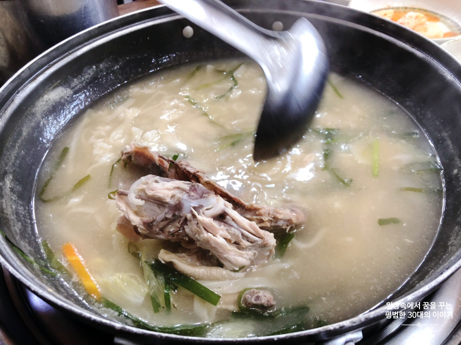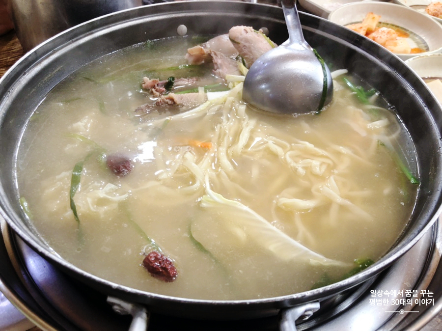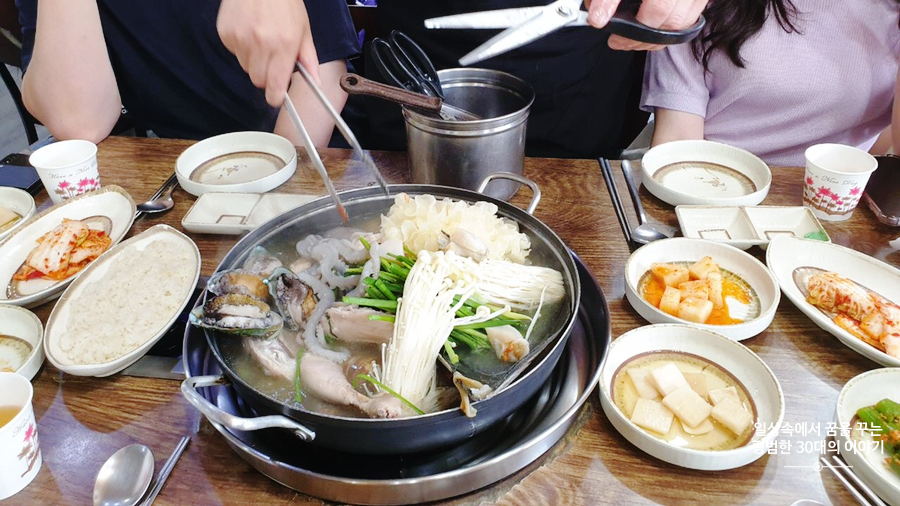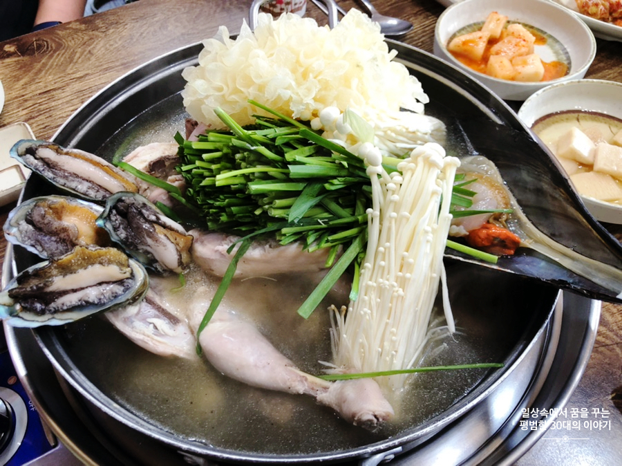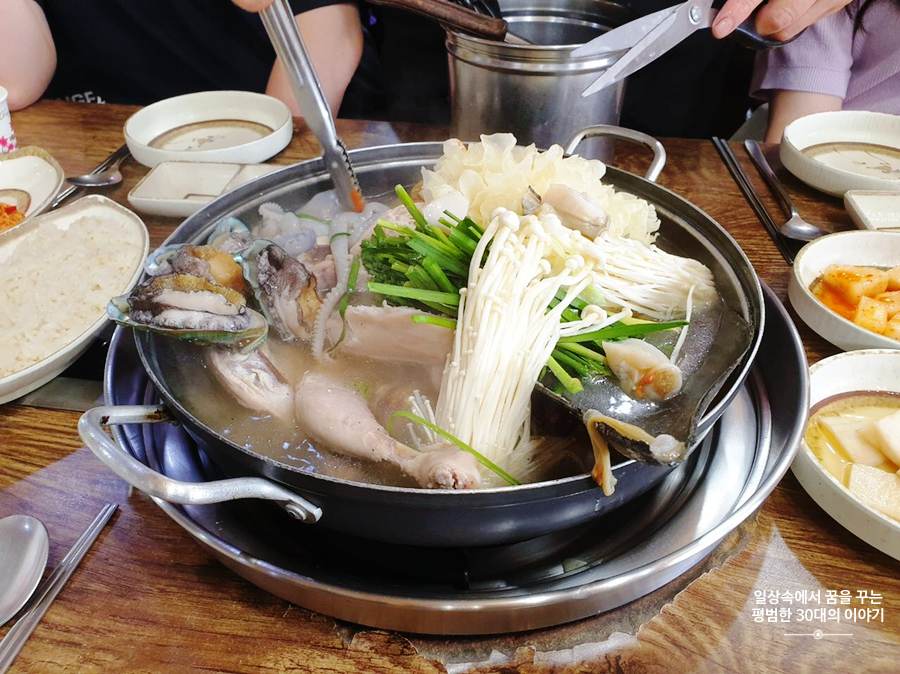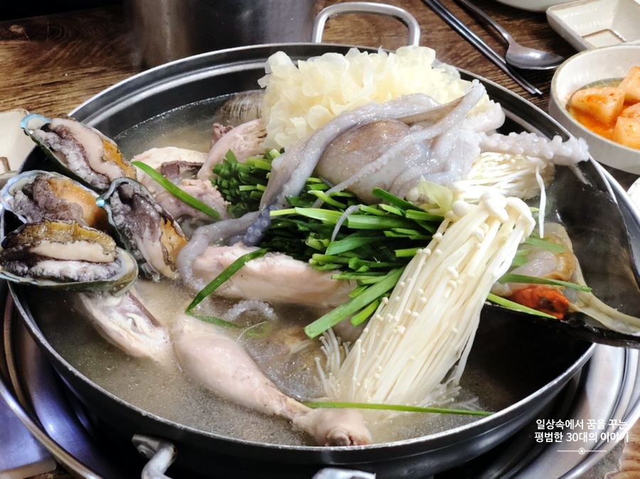 우리는 원래 갈 때마다 문어를 추가하는데 이번에는 그냥 해신탕 4인 55000원을 주문했다. 거기에 나중에 칼국수 사리만 추가했는데도 4명이서 배 터지게 먹을 수 있었다. 기본 반찬으로 고추 된장 무침, 깍두기, 김치 그리고 무초절임이 나오고 해신탕에는 키조개, 전복, 낙지, 닭 한 마리, 부추, 버섯, 팽이버섯 등이 들어가 있다. 물론 해신탕 치고 해물이 많이 들어있는 편은 아니지만 가격을 생각하면 수긍이 되는 부분이다. 국물은 간이 거의 되어있지 않아 심심하지만 그 깊이는 깊다. 마지막에 칼국수랑 죽까지 끓여먹으면 최고! 특히 마지막에 죽이 피날레로 무조건 먹어야 된다! 간만에 몸보신한 날로 동생 덕분에 소원 성취했다.