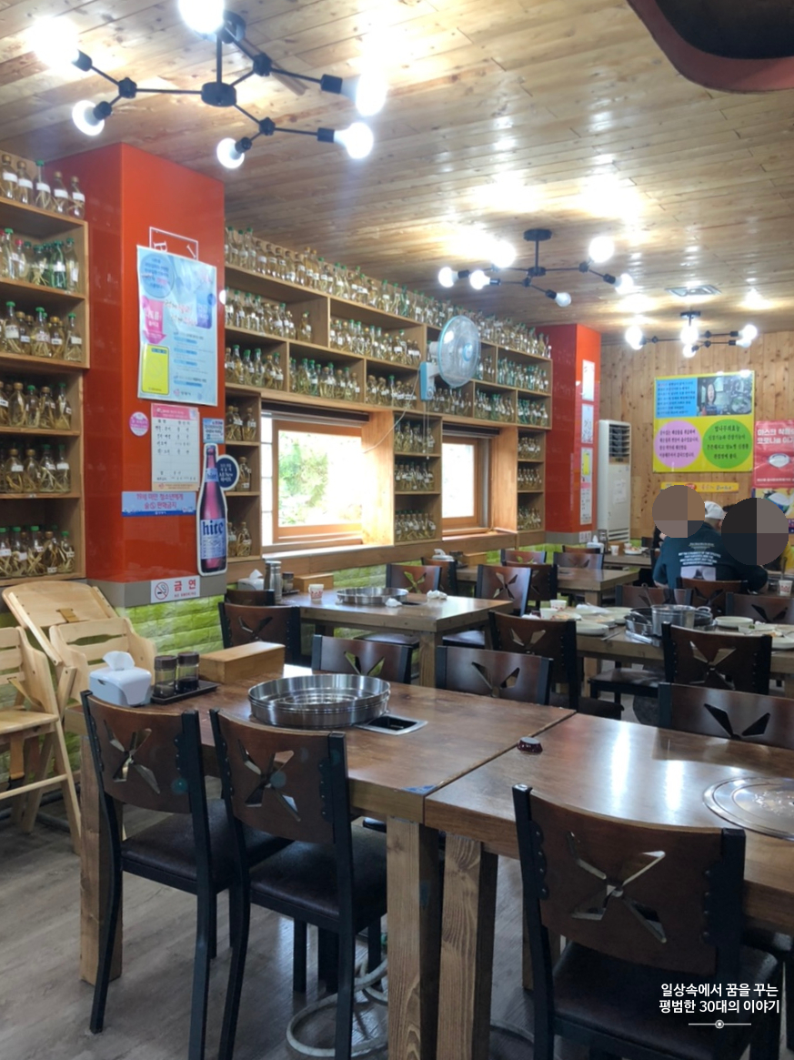 내부는 겉에서 봤을 때보다 그다지 넓지 않고 주차공간도 넓은 편은 아니다. 들어서자마자 한 쪽 벽면을 가득 채운 술병이 눈에 띈다. 술병마다 술병 주인의 이름이 적혀있다. 내부 인테리어는 오래되었지만 깔끔하게 관리되는 편이다.