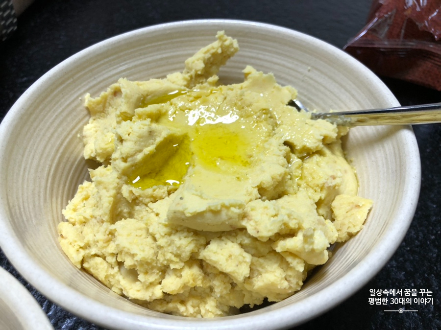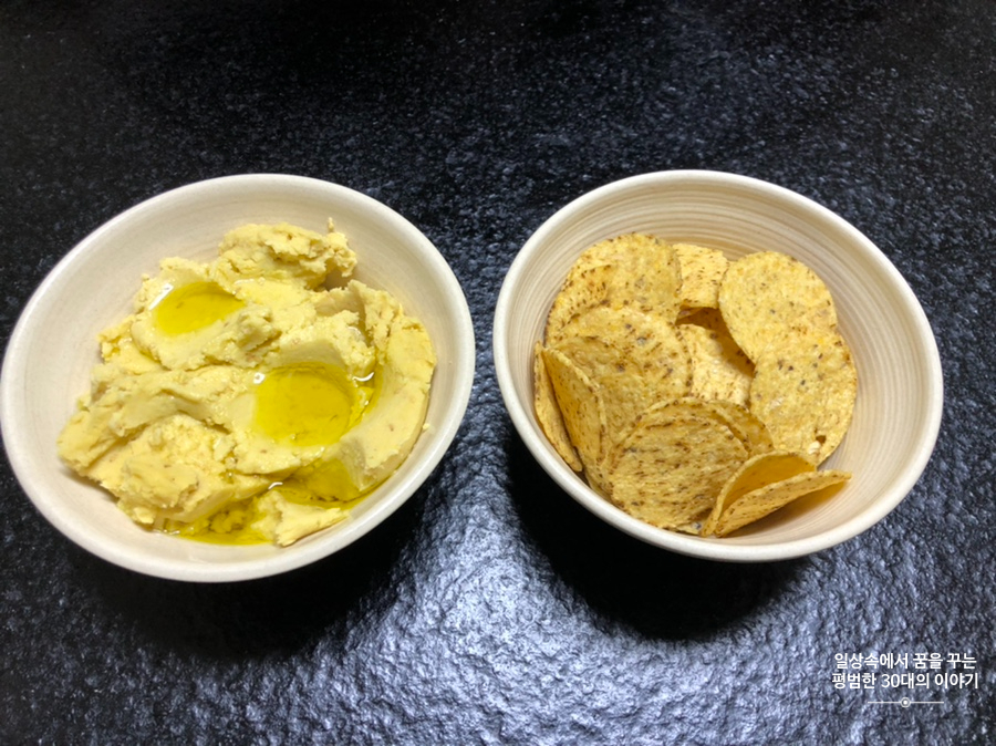 후무스 - 병아리콩, 마요네즈, 깨소금, 소금, 다진 마늘, 라임즙, 올리브오일