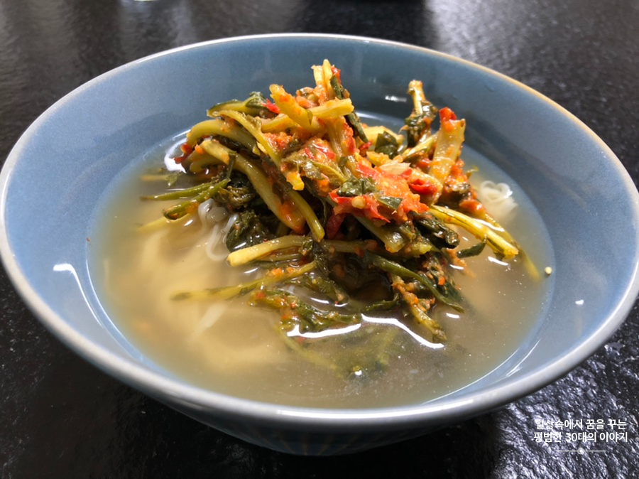 메뉴: 뭇국, 공심채볶음, 계란후라이, 무말랭이무침, 노각무침, 조미김