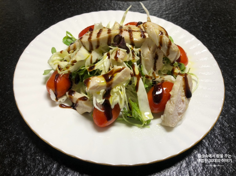 닭가슴살 샐러드 - 닭가슴살, 방울토마토, 양배추, 새싹야채, 발사믹소스, 아보카도 올리브오일