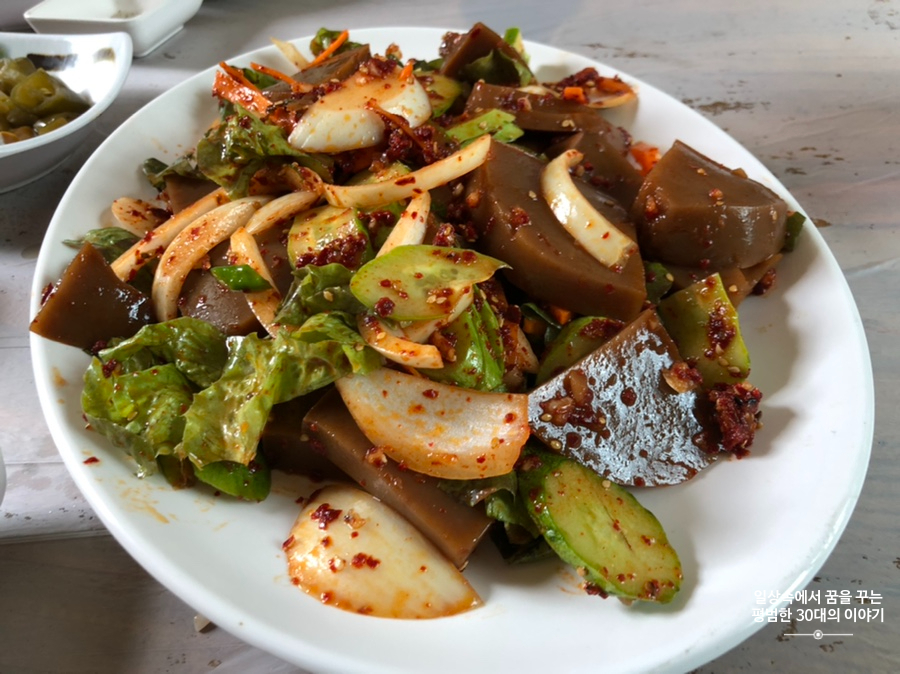 도토리묵사발 - 도토리묵, 호박, 김치, 파프리카, 깻잎, 오이, 냉면육수, 김가루, 삶은 계란