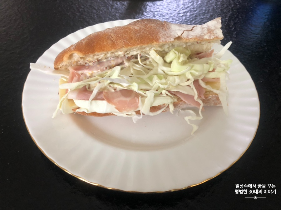 잠봉샌드위치 - 바게트, 양배추, 잠봉, 하바티치즈, 마요네즈, 라임즙, 꿀, 머스터드