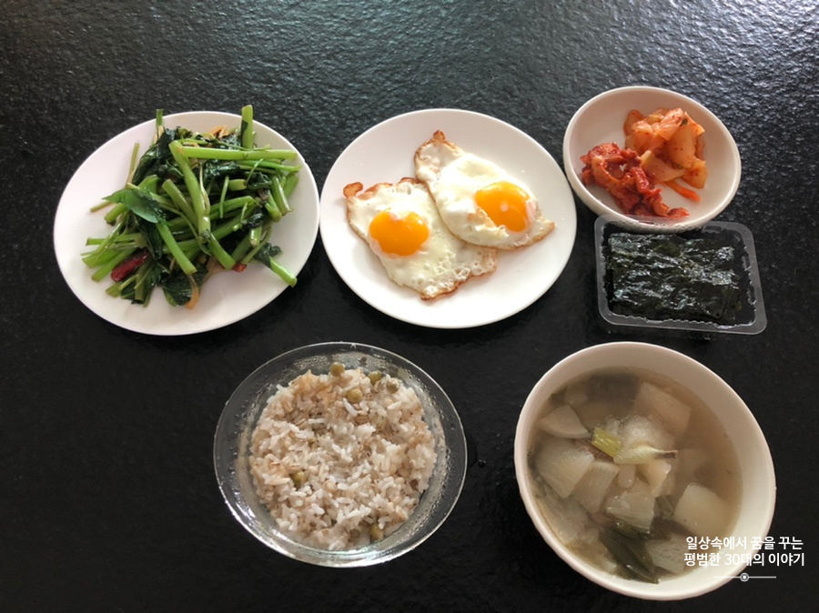 점심: 뭇국, 공심채볶음, 계란후라이, 무말랭이무침, 노각무침, 조미김