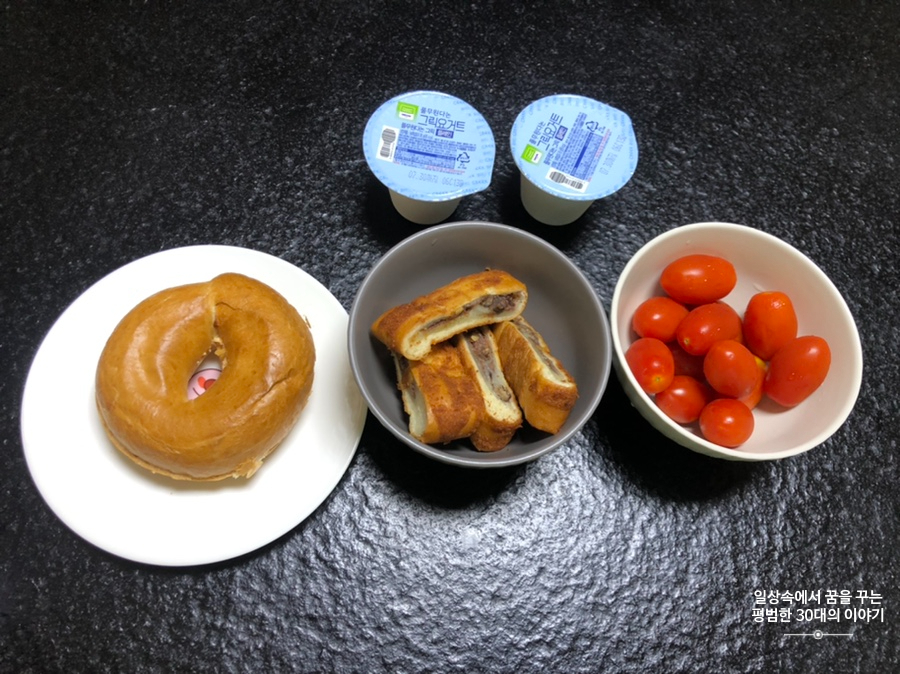 메뉴: 나(찹쌀떡빵, 방울토마토), 남편(요거트, 베이글 샌드위치)