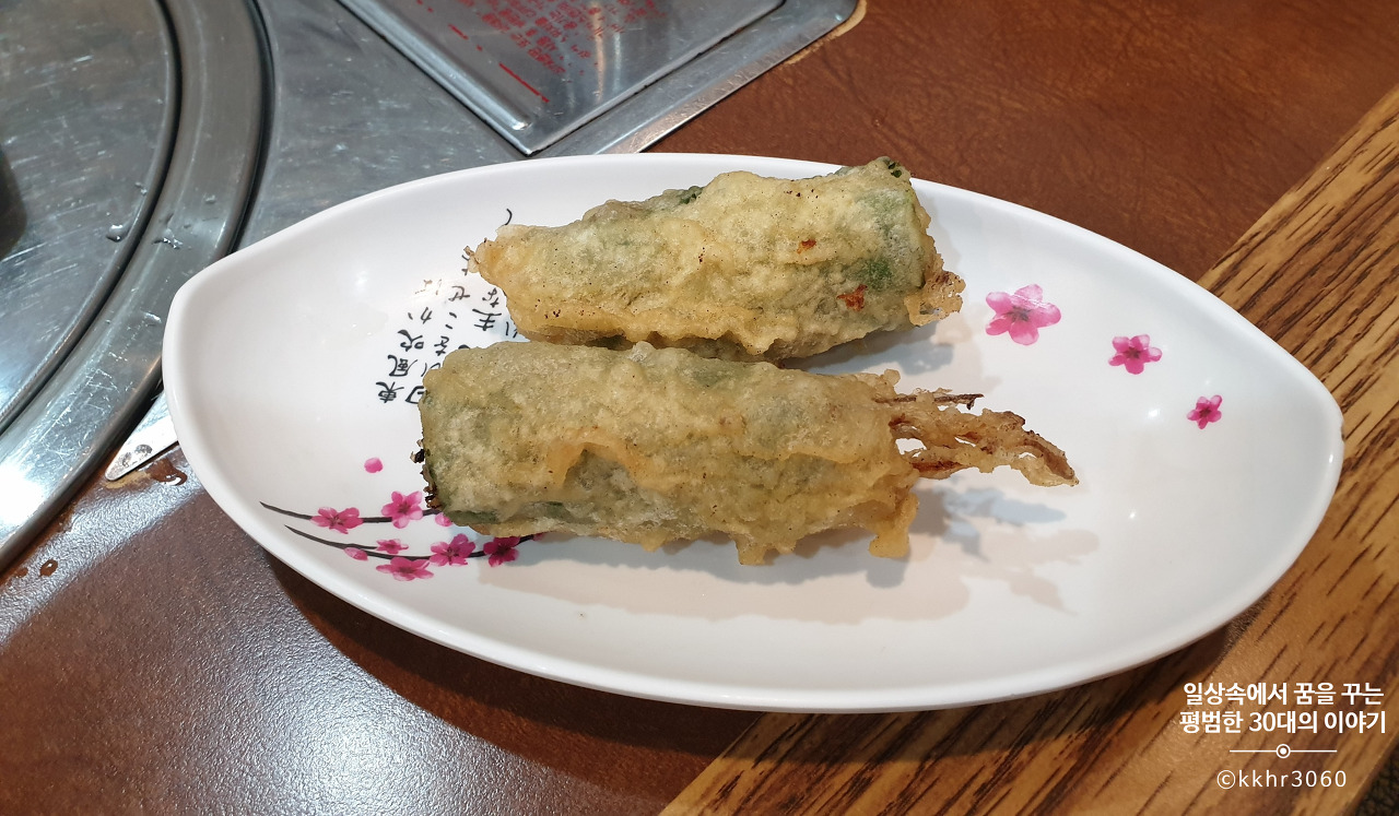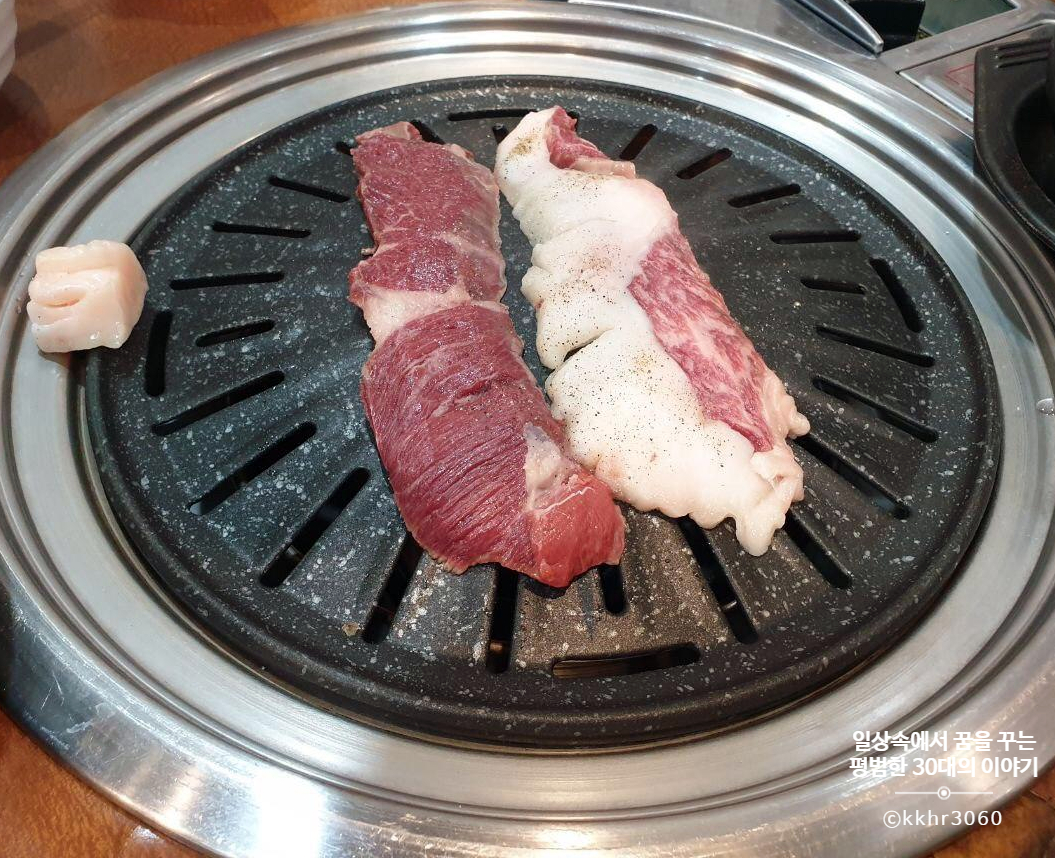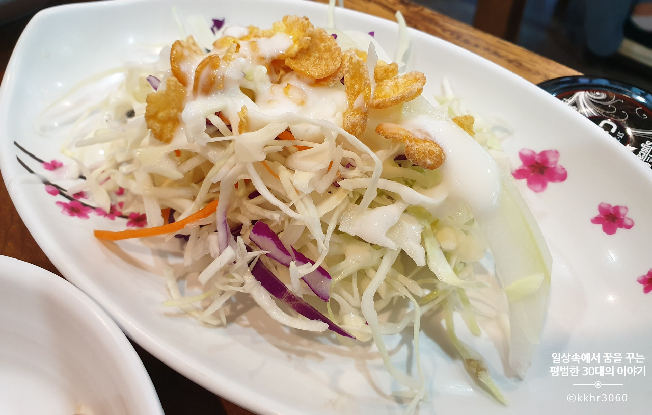 주문을 하자마자 테이블 위에 기본 반찬으로 김치, 양배추 샐러드, 옥수수 콘 마요네즈 샐러드, 양파장아찌 그리고 무장아찌가 놓인다. 맛은 지극히 평범했다. (맛이 있지도 없지도 않는 그런 맛) 그래도 그중에서 무장아찌는 내 입맛에 잘 맞아서 두 번 리필해서 먹었다. 맛있어서도 있지만 말고기가 생각보다 먹다 보니 느끼해서 뭔가 상큼한 게 필요했기 때문이다.
