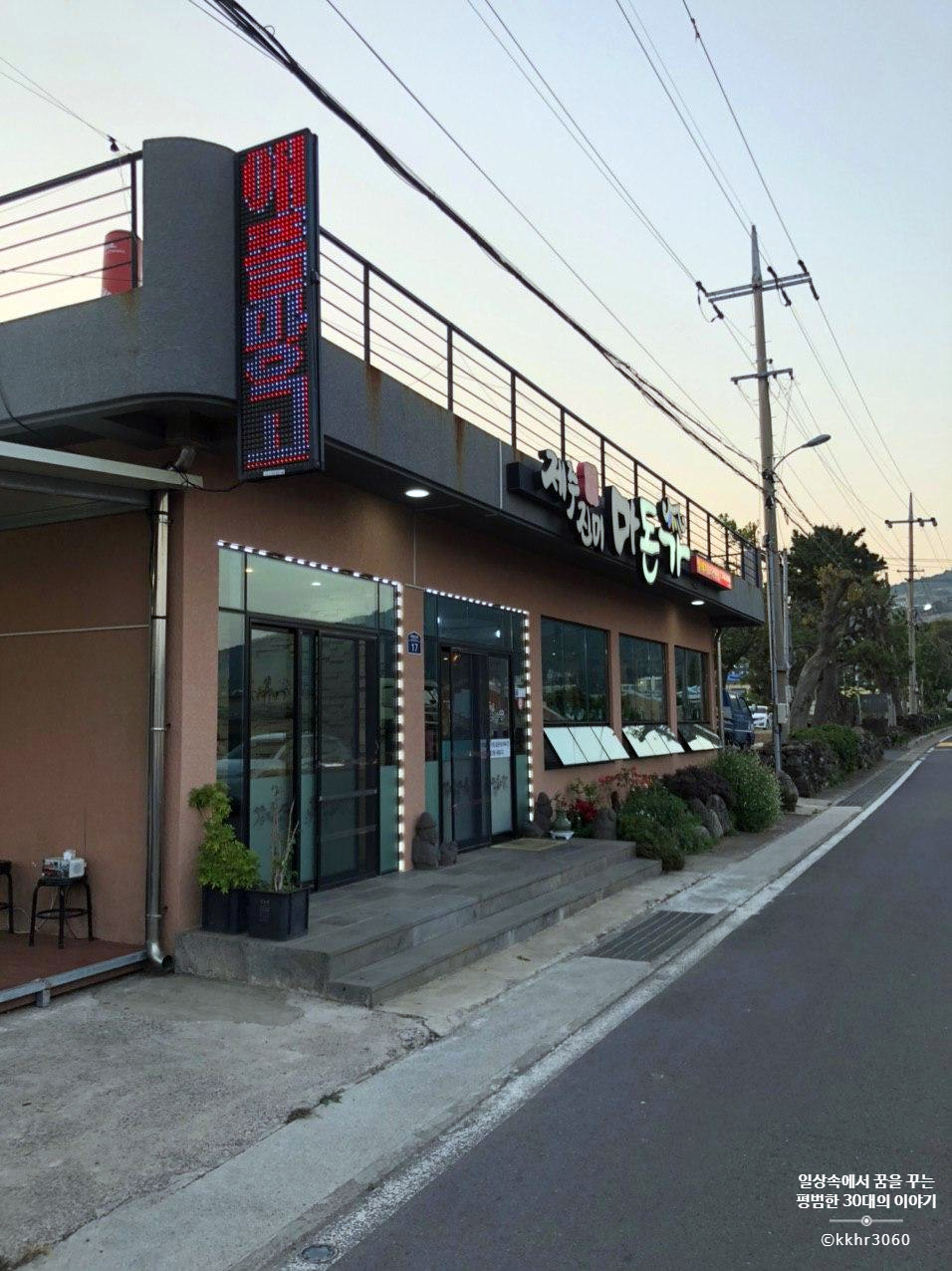 제주 진미 마돈가는 이 마을의 메인 거리에 위치해있다. 메인 거리라고 해봤자 100m 정도 되는 거리이지만 그래도 어쨌든 이 주변으로 식당, 편의점, 버스정류장, 카페가 몰려있다. 이른 저녁시간에 방문해서 그런지 우리가 식당에 들어갔을 때는 한 테이블 정도 손님이 있었다. 공간이 꽤 넓어 단체 손님이 와서 먹기에도 부족함이 없을 듯하다.