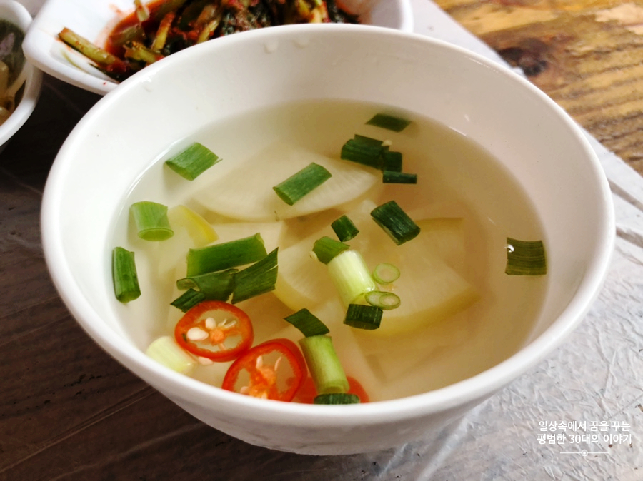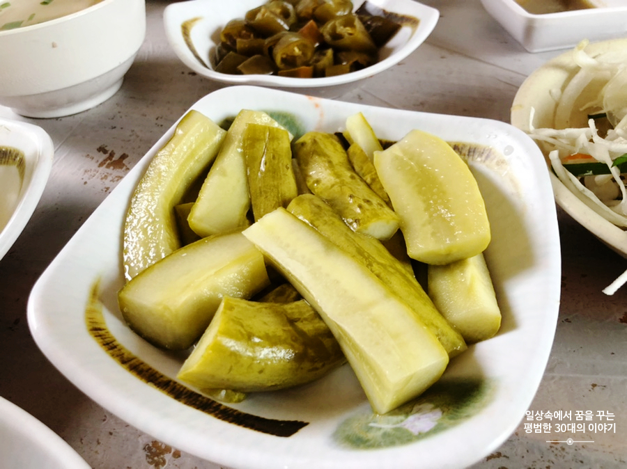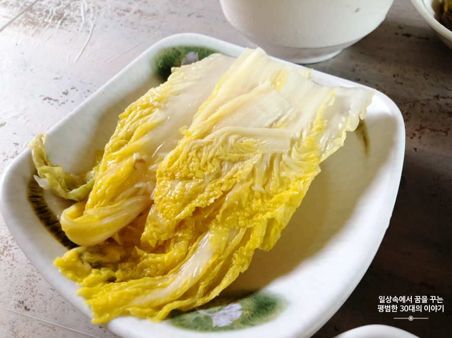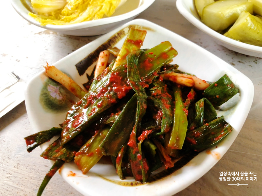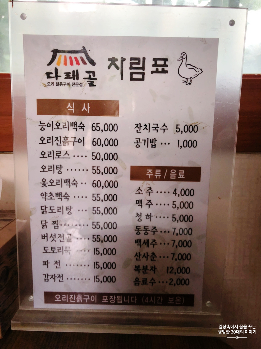 우리는 네 명이서 오리진흙구이(60000원), 감자 전(15000원) 그리고 도토리묵(15000원)을 주문했다. 우리는 예약을 하고 방문한 것이기 때문에 자리에 앉자마자 얼마 되지 않아 주문한 메뉴가 모두 준비되었다. 기본 반찬은 모두 직접 만든 것인지 조미료 맛이 많이 나지 않고 시골 할머니가 해주시던 집 반찬 맛이 나서 무척 만족스러웠다. 심지어 외식할 때마다 까다롭게 구는 엄마도 반찬이 맛있다며 무척 흡족해하셨다. 내 최애는 파김치였고 엄마의 최애는 백김치!