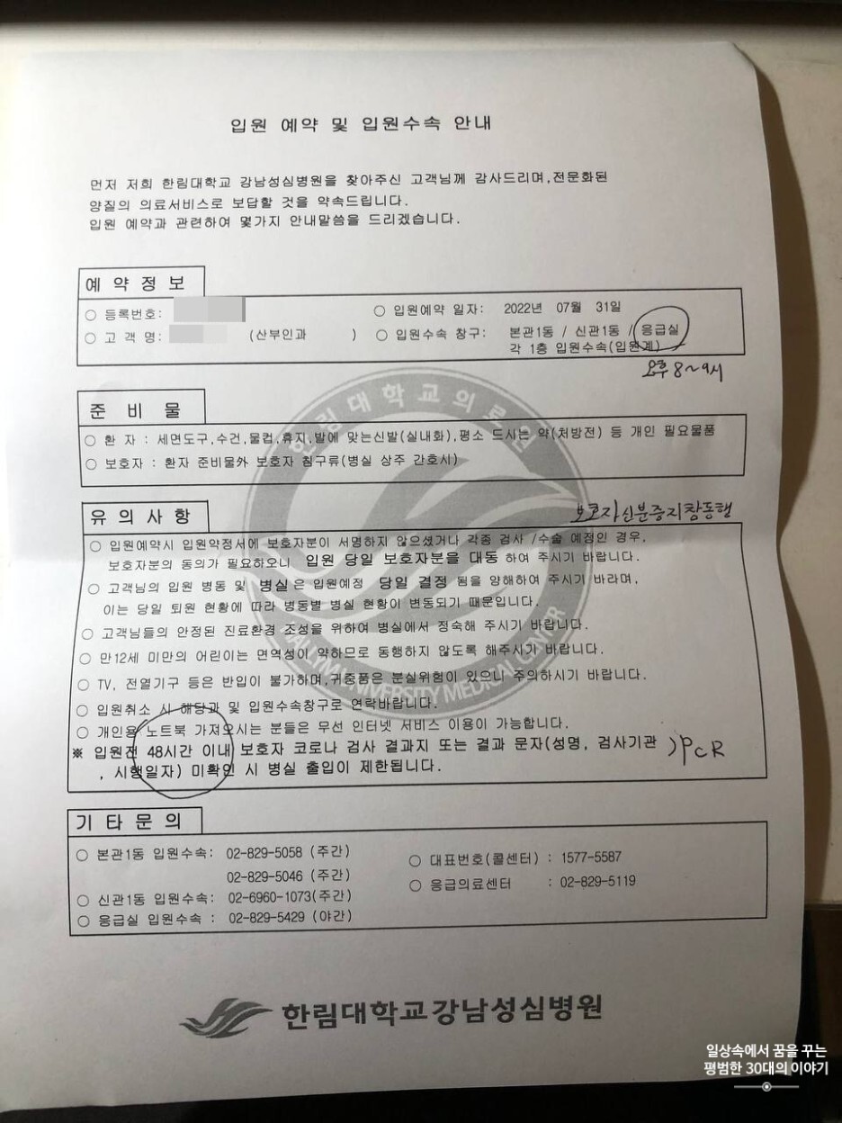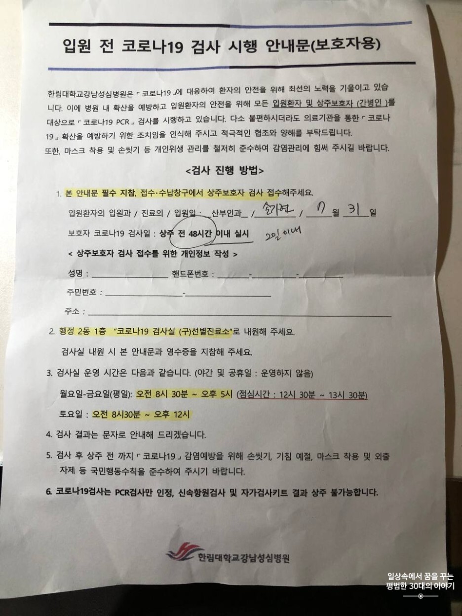 강남성심병원은 현재 코로나 상황으로 인해 분만 시, 1명의 상주보호자를 둘 수 있다. 상주보호자는 상주 전 48시간 이내 PCR 검사를 해야한다. 강남성심병원 내에 PCR 검사를 하는 곳이 있기 때문에 그 곳에 입원 전 코로나19 검사 시행 안내문(보호자용)을 가지고 방문하여 검사를 진행하면 된다.(강남성심병원 코로나19 검사실 선별진료소 운영시간 월~금요일 오전 8:30~17:00 / 점심시간 12:30~13:30, 토요일 8:30~12:00) 분만 날짜는 8월 1일(다음주 월요일)이고 하루 전날인 7월 31일(이번주 일요일) 저녁 8~9시 사이에 응급실로 가서 입원 수속을 하면 된다. 이때 보호자는 보호자 신분증 및 PCR 검사 결과지를 가지고 같이 입원 수속을 진행하면 된다. 원래 나도 PCR 검사를 해야하는데 나는 분만 날짜 한 달 이전에 코로나에 걸린 적이 있기 때문에 따로 PCR 검사를 하지 않아도 된다고 하였다. 대신에 코로나 양성 판정을 받은 메세지를 입원 수속할 때 보여줘야 한다.(다행히 아직까지 그 당시 코로나 양성 판정을 받은 메세지를 삭제하지 않고 보관하고 있었다)
