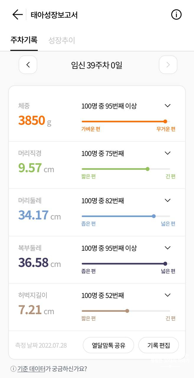 BPD(Biparietal Diameter, 위에서 볼 때 태아 머리 단면의 가장 긴 길이): 9.57cm