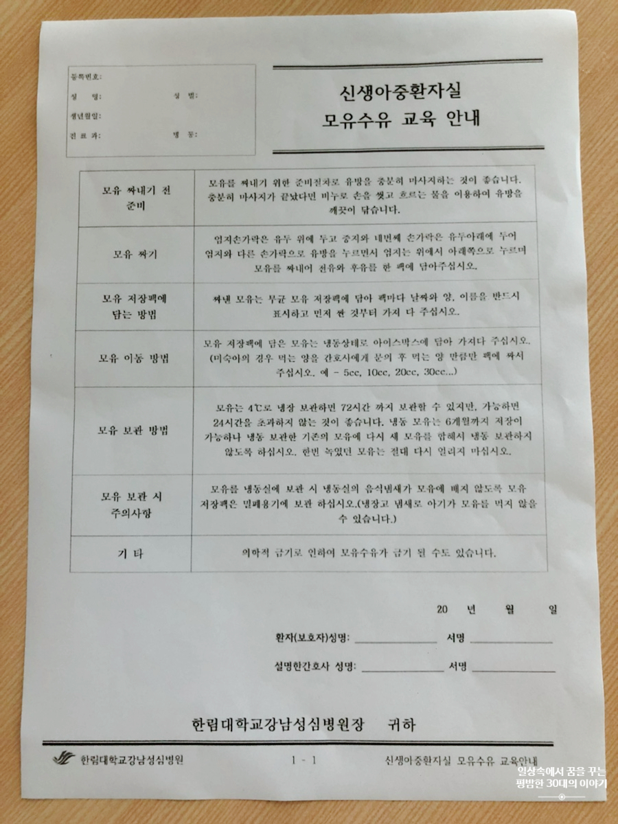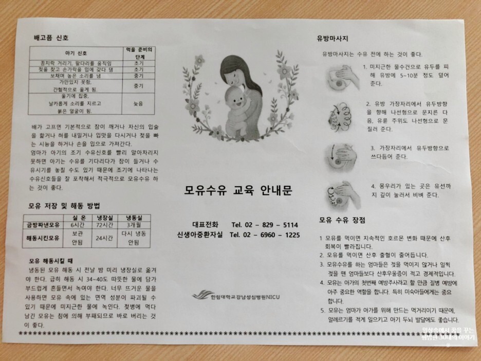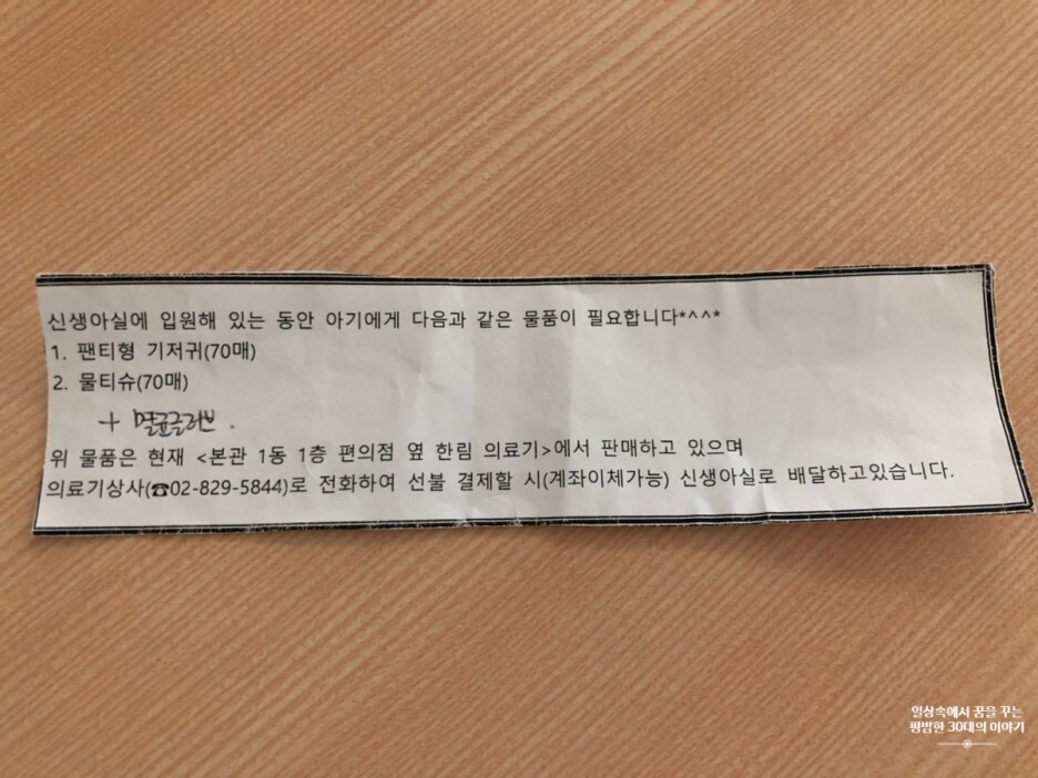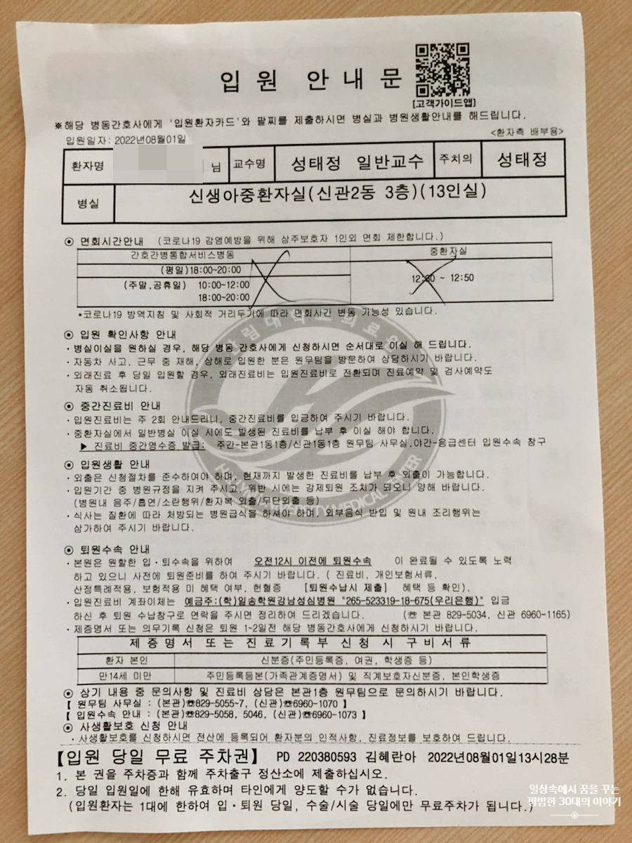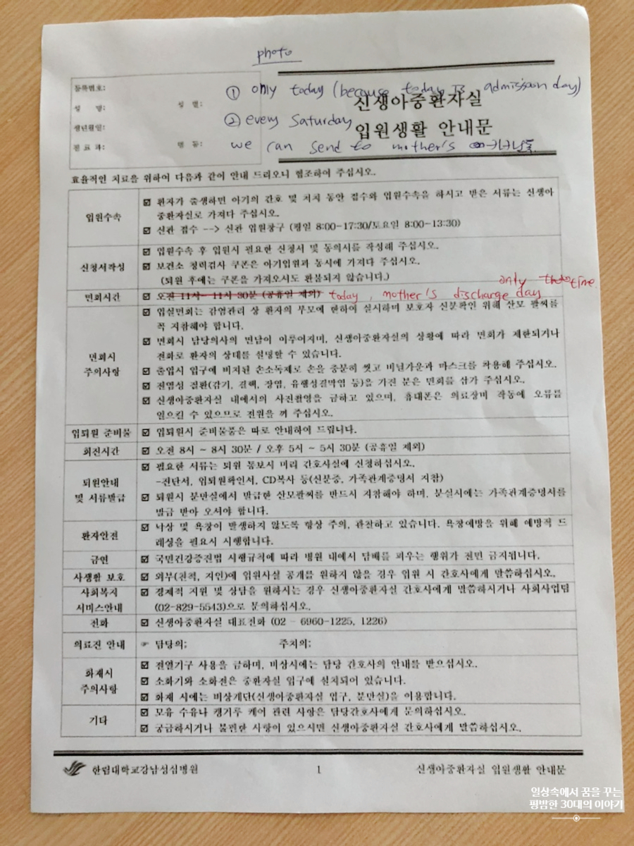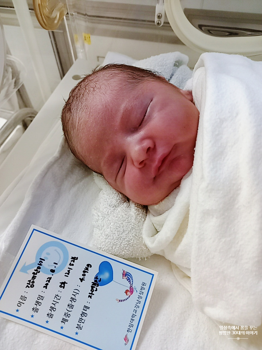 아기는 태어났을 때 얼굴이 너무 파랗고 울음소리가 늦게 터진 데다가 몸무게가 주차 수에 비해 너무 많이 나가 출산 과정에서 뼈가 부러졌을 수도 있고 어쨌든 우량아라 바로 신생아 중환자실로 감, 남편은 아기와 함께 나가 아기 입원 수속 진행 및 아기에게 필요한 기저귀(70매), 물티슈 한 팩, 멸균 글러브를 갖다줌(참고로 신생아 중환자실은 특별한 상황이 아닌 이상 면회가 불가(8월 1일 기준), 그래서 난 아기를 출산하고 아기를 한 번도 못 봄, 나는 자연분만이라 2박 3일 후 퇴원이라 수요일에 퇴원하고 아기는 아무 문제 없으면 금요일이나 토요일쯤 퇴원하게 될 것 같다는데 그러면 내가 퇴원하는 날 처음 볼 수 있다고 함, 그리고 신생아 중환자실에서 매주 월, 토요일에 아기 사진을 찍어서 보호자에게 보내줌)