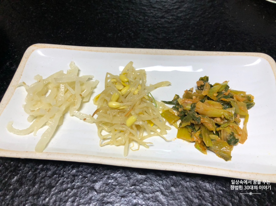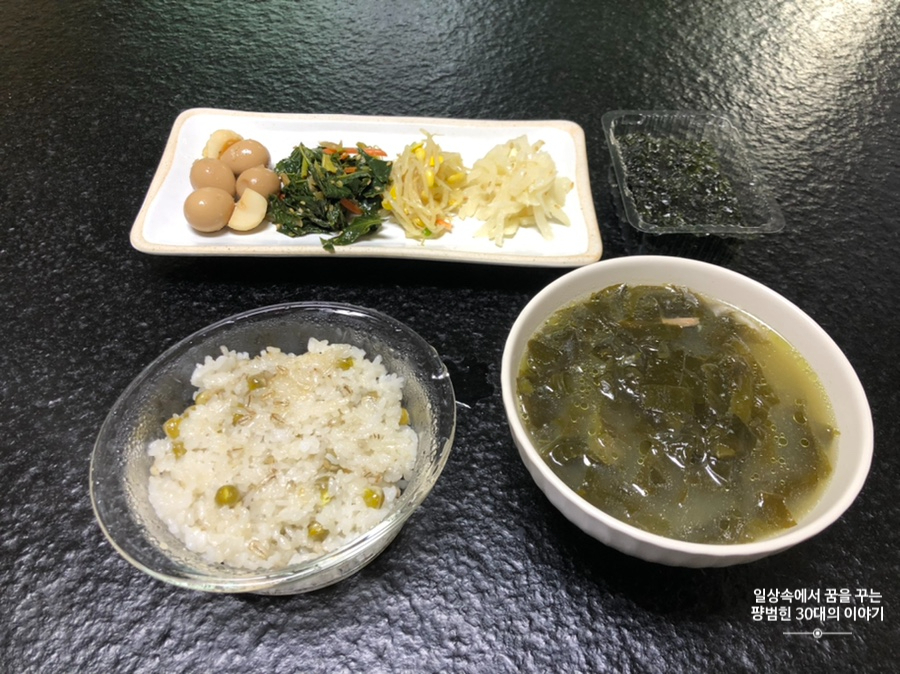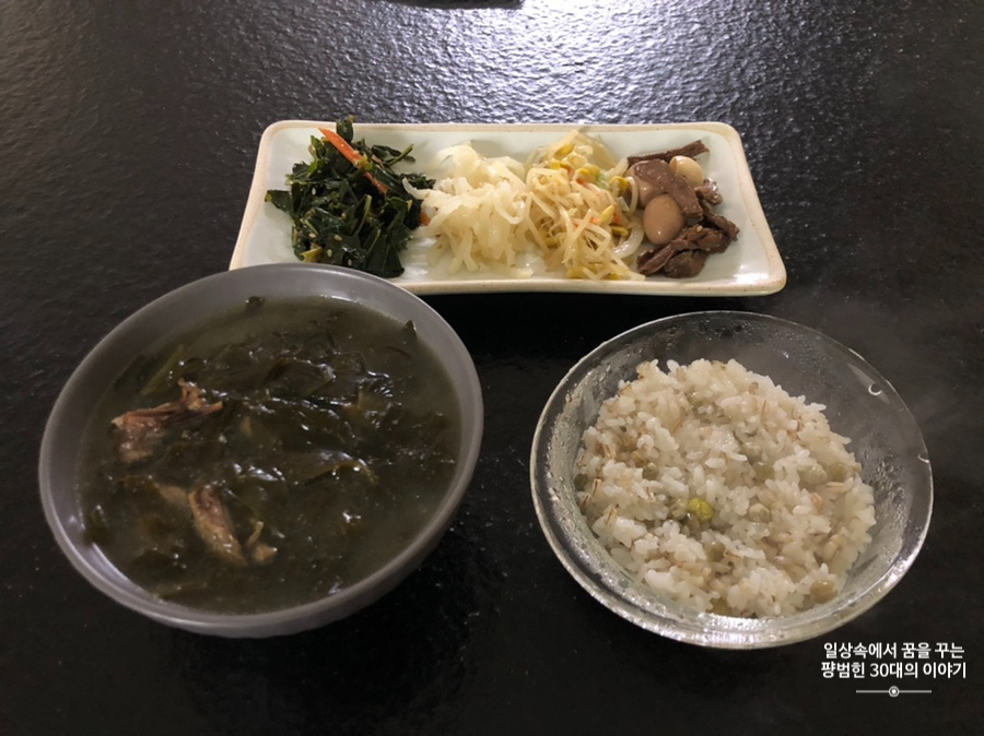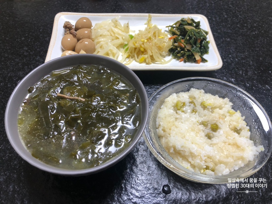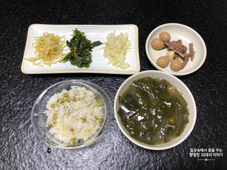 메뉴: 콩나물 나물, 취나물, 무나물, 장조림, 미역국