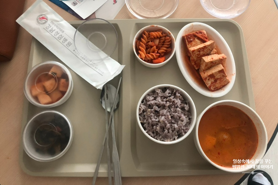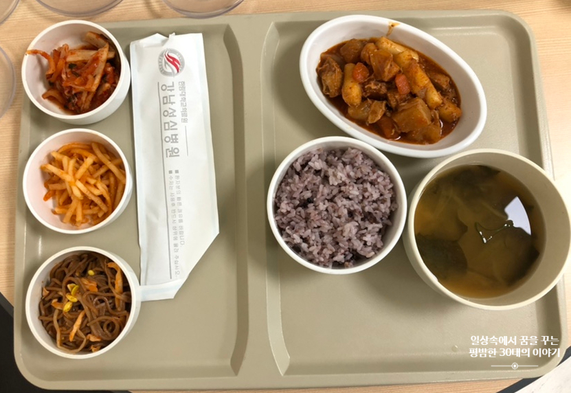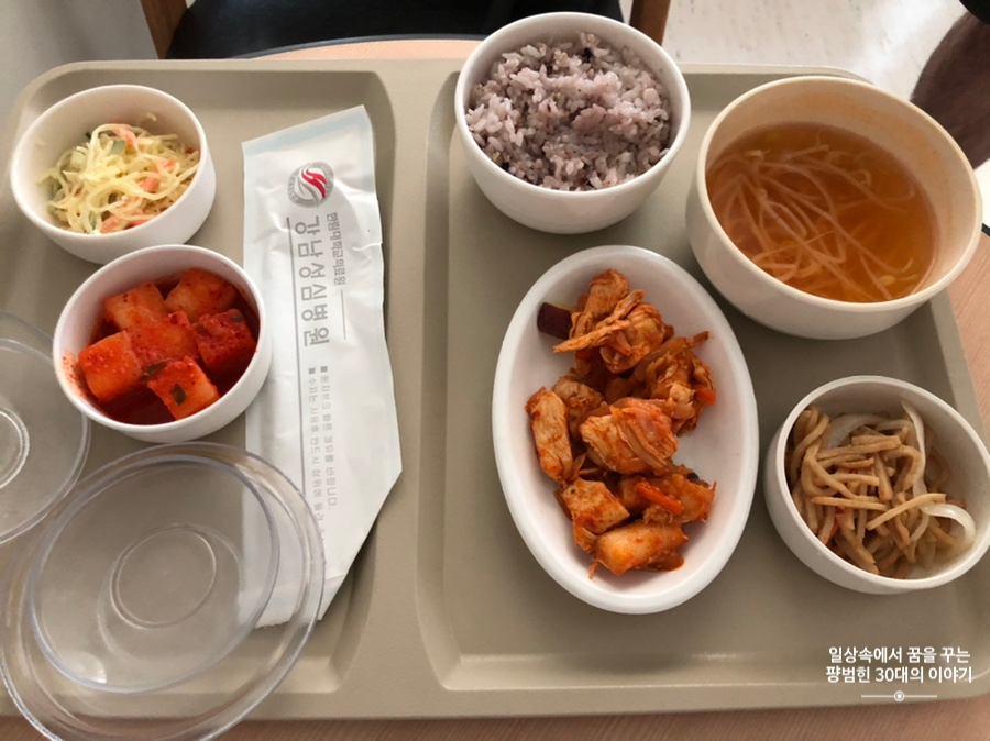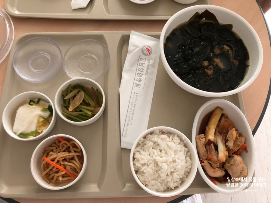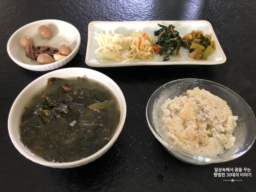 점심: 나(콩나물 나물, 취나물, 무나물, 장조림, 조미김, 미역국), 남편(삼계죽)