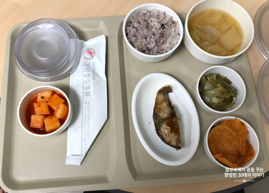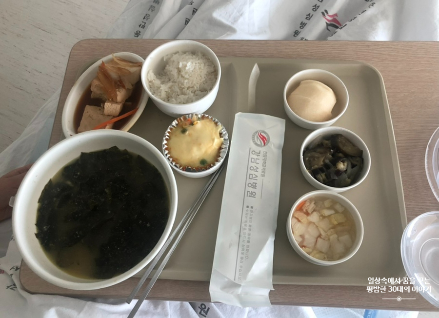 메뉴: 나(콩나물 나물, 취나물, 무나물, 장조림, 조미김, 미역국), 남편(삼계죽)