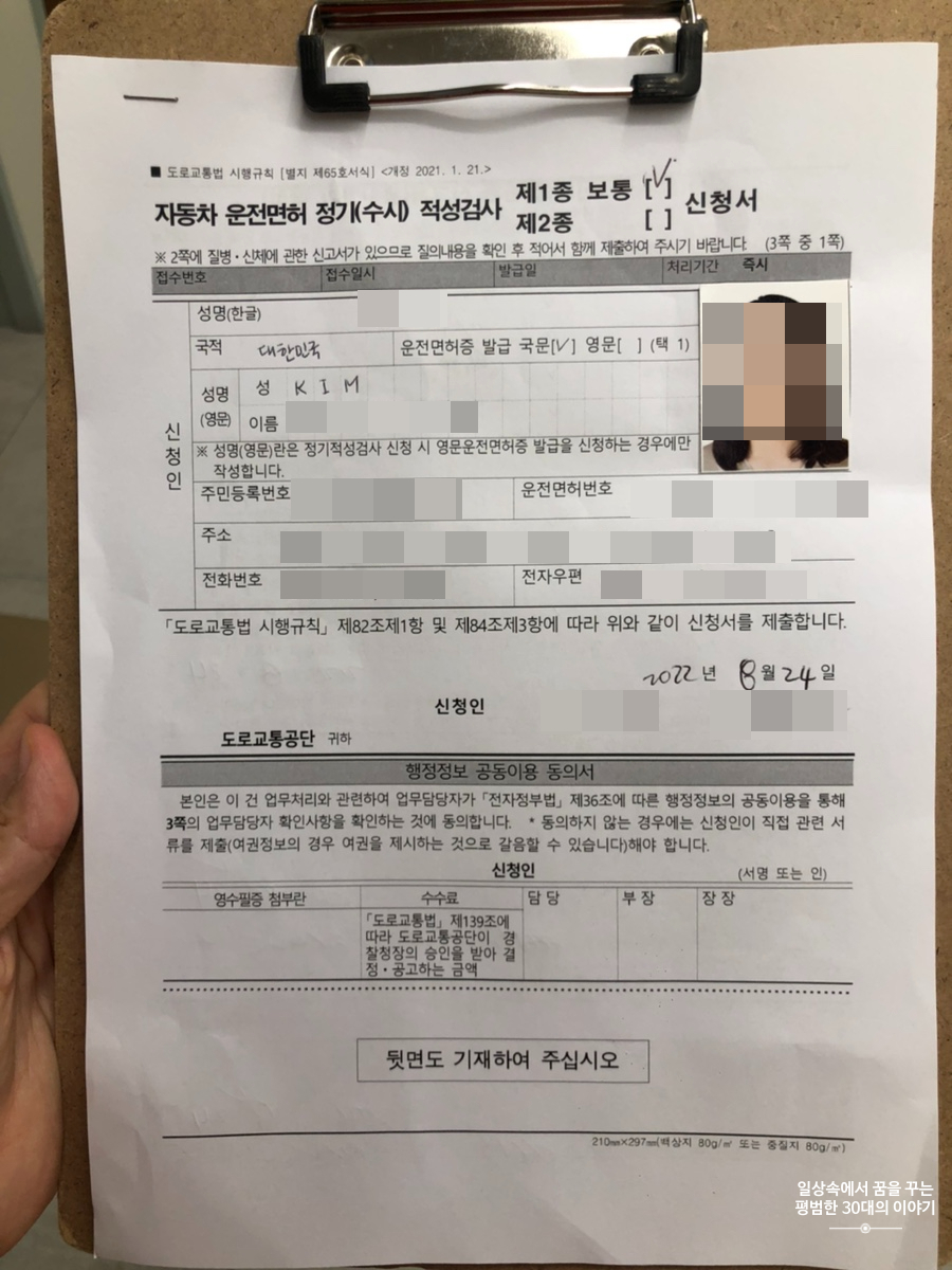 영등포 병원에서 발급해 준 서류를 들고 영등포 경찰서 종합민원실 1층의 2번 창구에서 운전면허증 1종 보통 적성검사(갱신)를 신청하면 된다. 이때, 영등포 병원에서 사진 1장과 영등포 경찰서 종합민원실에서 사진 1장 총 2장의 사진이 필요하다. 운전면허증 1종 보통 적성검사(갱신) 신청 시, 기존의 운전면허증은 반납해야 하므로 꼭 가지고 가야 한다. 비용은 총 18800원이었다.(기본 비용 13000원+영문 운전면허증 발급 추가비 2000원+신규 운전면허증을 집에서 받고 싶은 경우, 배송비 3800원) 신규 운전면허증을 받는 데까지 4주가 소요된다고 하나 후기를 찾아보니 대부분 4주까지 소요되지는 않는 것 같더라. 생각보다 복잡했던 운전면허증 1종 보통 갱신! 10년에 한 번 운전면허증을 갱신해야 하는데 10년 동안 운전을 한 횟수는 손에 꼽으니 사실 면허증 갱신을 안 해도 무방하나 그래도 혹시 모를 상황을 대비해 면허증 갱신은 열심히 하고 있다.
