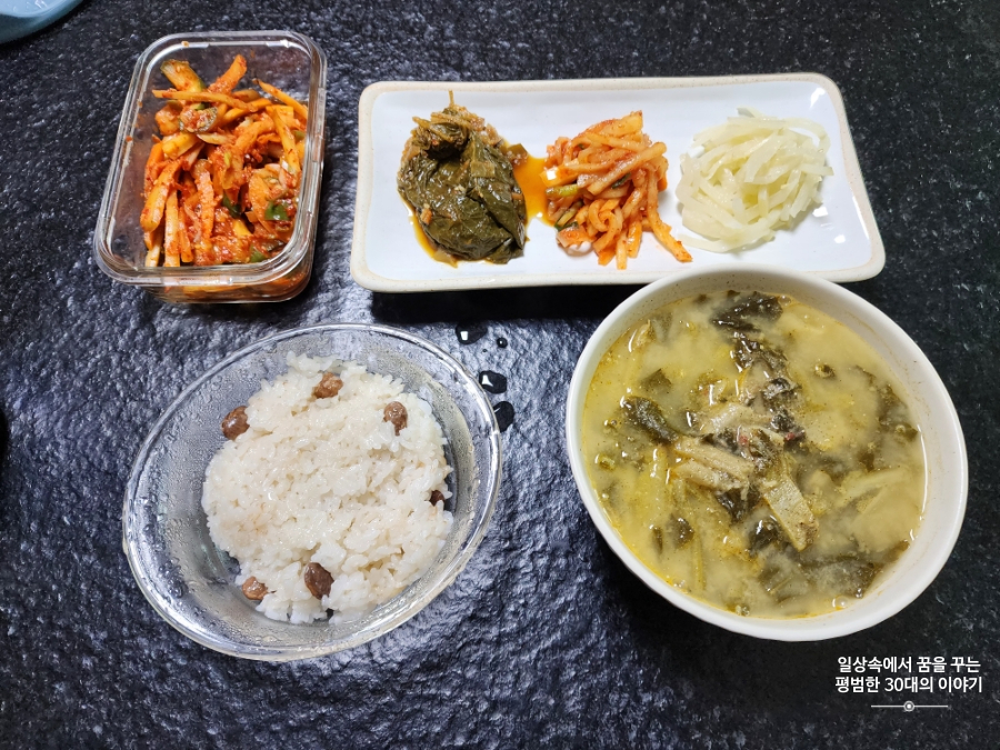 저녁: 라지무침, 무나물, 깻잎무침, 무생채, 추어탕 |