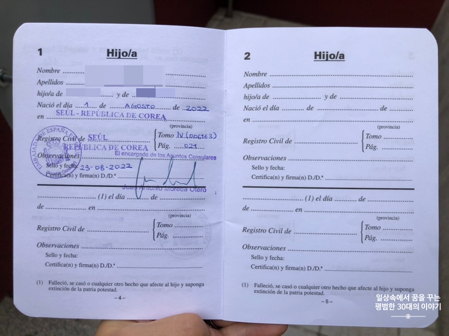 나는 국제부부로 아이를 출산한 후, 한국에만 출생신고를 해야 하는 것이 아니라 스페인에도 출생신고를 해야 한다. 한국 출생신고를 간단히 마치고 스페인 대사관에 출생신고에 필요한 서류를 잔뜩 들고 방문해 출생신고를 했다. 혼인신고의 과정이 2개월 넘게 걸렸던 탓에 출생신고도 오래 걸릴 줄 알고