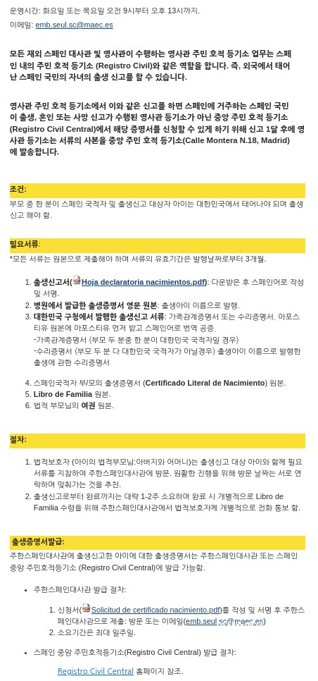 4. 스페인 대사관에 필요서류를 준비한 후, 출생신고를 한다.