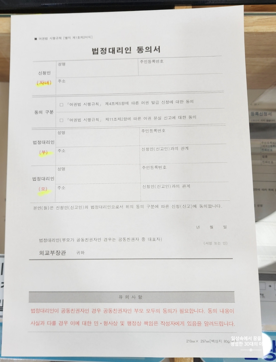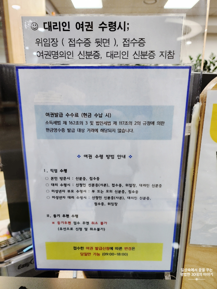아기가 2개월 밖에 안 되었으므로 내가 여권을 신청할 수 밖에 없는 상황이라 나 같은 경우, 우선 여권발급신청서와 법정대리인 동의서를 작성하여 7번 여권 접수 안내 창구에서 작성한 서류에 오류는 없는지 여권 사진은 적절한지 등을 검토 받은 후, 여권 접수 창구의 대기 번호표를 받으면 된다.(나는 국제부부라 아기 여권을 신청할 때, 추가로 남편의 외국인등록증 혹은 여권을 요청하셨다. 다행히 혹시나 하고 가져간 외국인등록증이 빛을 발했다. 안 가져갔으면 헛걸음 했을 뻔) 여권 접수 대기 번호표에 따라 여권 접수 창구에서 여권 접수를 신청하면 된다.(이때 여권 사진은 1장 필요함) 2개월 된 아기는 최대 5년짜리 여권만 만들 수 있고 접수비는 33000원이다. 그리고 나는 여권을 집에서 등기로 받고 싶었기에 등기비로 5500원을 추가로 지불했다. 보통 여권 접수일 이후 7~10일 뒤에 여권을 받을 수 있다고 안내 받았는데 10월 5일(수요일)에 여권 접수를 하여 10월 7일(금요일)에 등기로 여권을 받았다. 즉, 2일만에 여권을 받았다. 빠른 한국의 행정 서비스에 남편과 나는 다시 한 번 놀라움을 금치 못했다.(특히나 행정 서비스가 느린 스페인에서 온 남편은 매번 한국의 행정 서비스 속도에 놀람, 물론 이런 빠른 서비스는 많은 분들의 노고로 이루어지는 것이기 때문에 항상 그 분들에게 감사하다.)