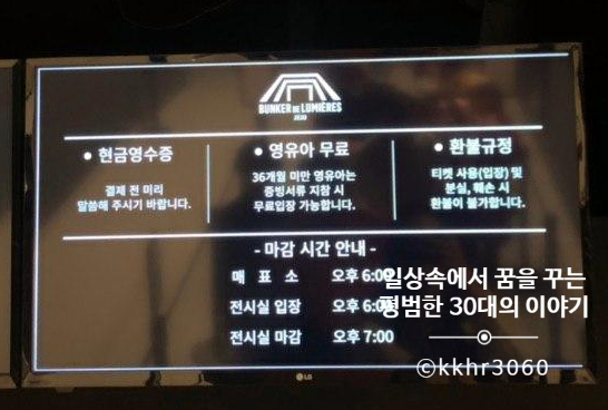 처음에는 빛의 벙커에 대한 대략적인 정보만 알아보고 간 것이기 때문에 타임 테이블이 왜 있는 건지 의문이었지만 보고 나니 왜 있는지 알 수 있었다. 가보면 알겠지만 이게 미디어아트라서 예술가들의 작품을 영상화하여 전체 벽면에 프로젝터로 틀어주는 방식으로 사람들이 작품을 감상할 수 있도록 만들어진 공간이기 때문이다. 한 번 틀 때마다 50분 정도가 소요되고 그 시간 동안 다양한 내용으로 작품을 벽면에 보여준다. 그렇기 때문에 이왕이면 타임 테이블을 봐뒀다가 시간에 맞춰 입장하는 게 좋다.