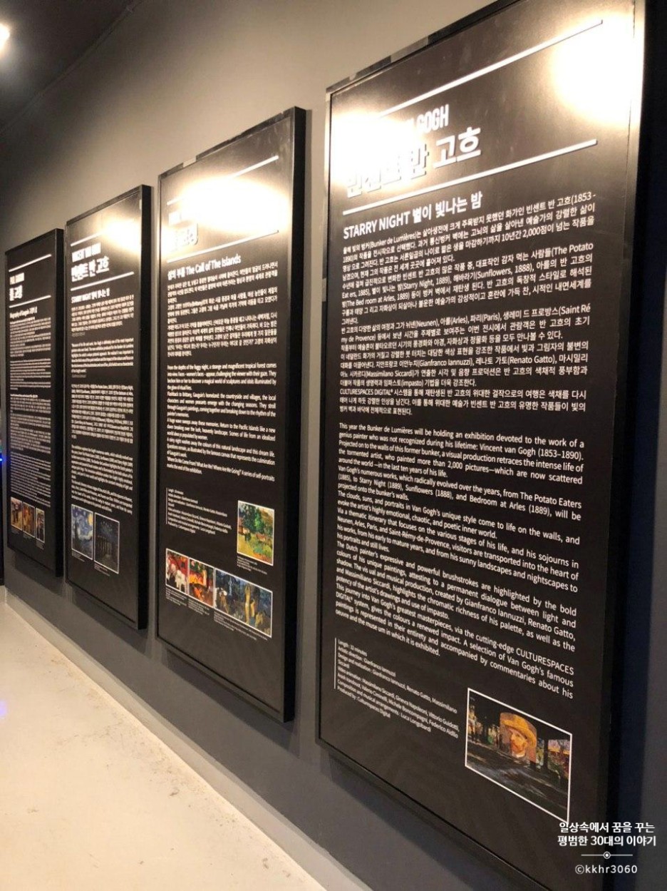 수십 개의 프로젝터와 스피커가 설치되어 있음에도 어찌나 구석구석 잘 설치해뒀는지 작품을 감상하기에 거슬리거나 하는 부분이 전혀 없었다. 영상미는 황홀하다 못해 빈센트 반 고흐의 '별이 빛나는 밤' 그리고 폴 고갱의 '섬의 부름' 작품이라기보다는 새롭게 재해석 된 새로운 작품처럼 느껴졌다. 해외여행을 갈 때면 미술관이나 박물관을 한 번쯤은 꼭 가곤 했는데 늘 수많은 사람들에 치여 제대로 작품을 감상하기에 어려움이 많았었다. 그런데 여기서는 자유롭게 넓은 공간에서 온몸으로 작품을 감상할 수 있어 너무 좋았다. 물론 입장료가 살짝 비싼 감이 없지 않아 있지만 워낙 오고 싶었던 곳이기도 하고 새로운 방식의 전시회다 보니 내 입장에서는 전시 내용이 바뀐다면 몇 번이고 계속 올 듯하다.