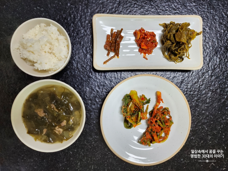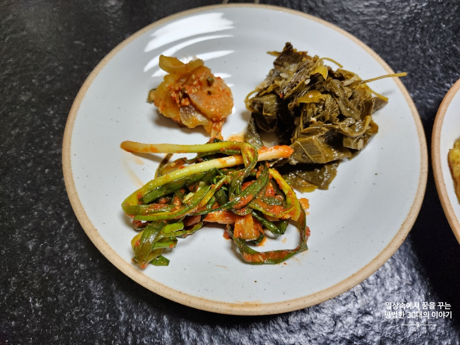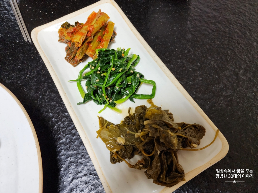 메뉴: 파김치, 갓김치, 시금치, 깻잎나물, 김치찜
