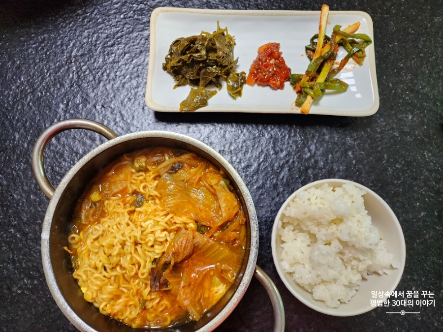 점심: 깻잎나물, 낙지젓갈, 파김치, 라면