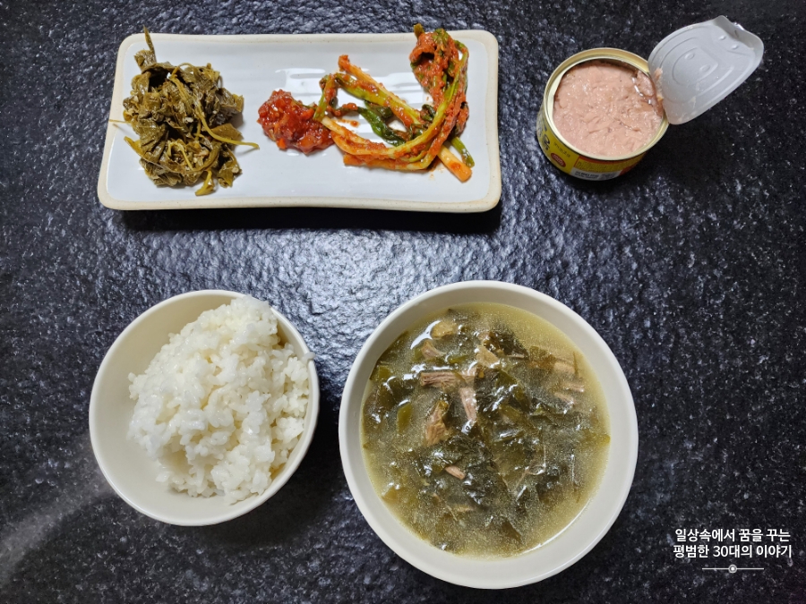저녁: 깻잎나물, 낙지젓갈, 파김치, 참치, 미역국 |