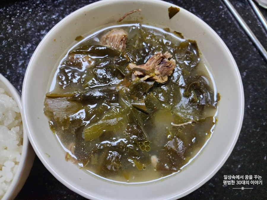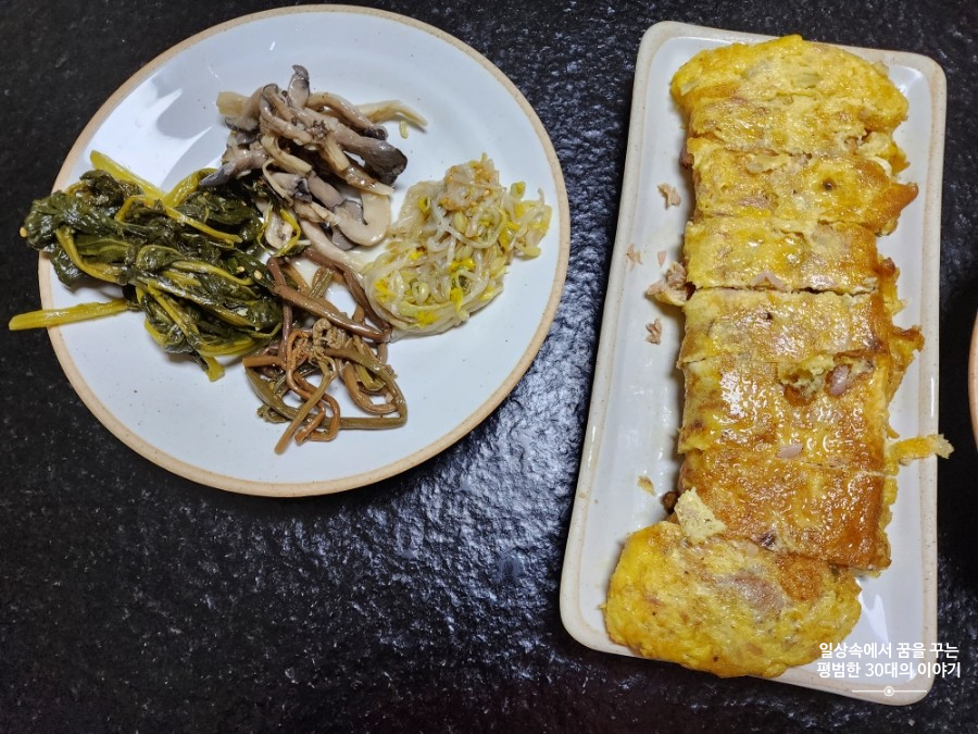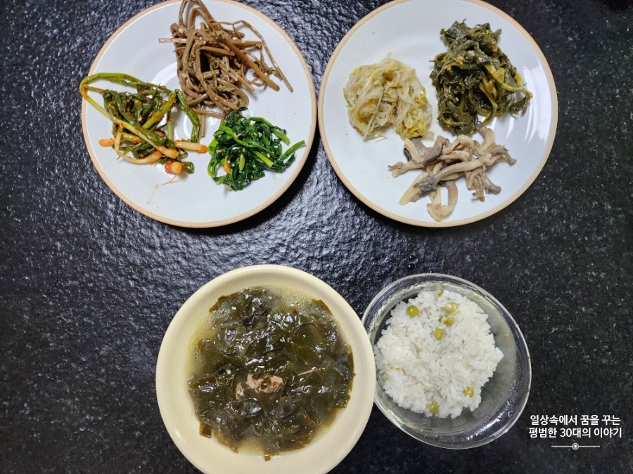 메뉴: 미역국, 버섯나물, 숙주나물, 고사리나물, 파김치, 시금치나물, 시래기나물