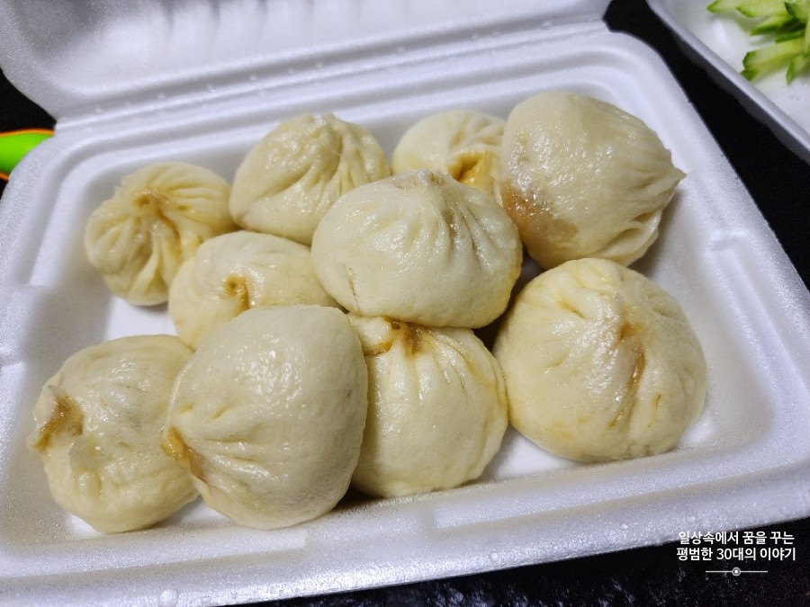메뉴: 포장(만두 및 량피), 닭가슴살 샐러드