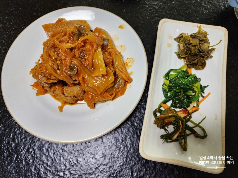 메뉴: 일요일에 먹고 남은 김치찜, 깻잎나물, 시금치나물, 파김치