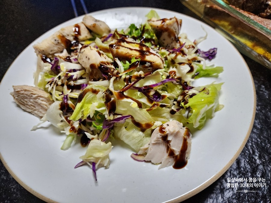 저녁: 포장(만두 및 량피), 닭가슴살 샐러드 |