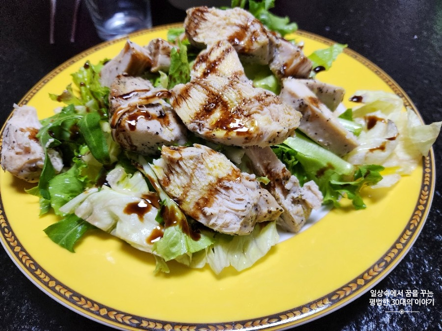 저녁: 양갈비구이, 닭가슴살 샐러드 |