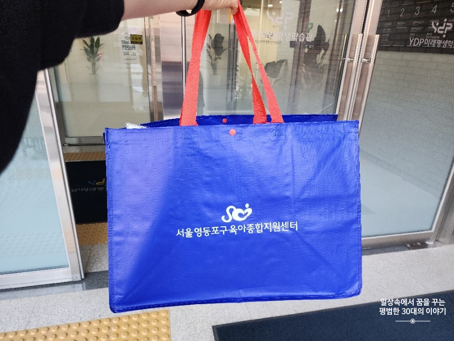 장난감을 대여할 때, 장난감을 담아 갈 수 있는 큰 가방도 함께 주시는데, 이게 은근 튼튼하고 여러모로 유용하다. 앞으로 자주 이용하게 될 것 같은 장난감 도서관이 나 같은 육아 동지에게 널리 알려지기를~