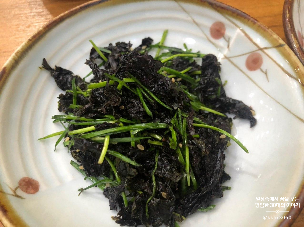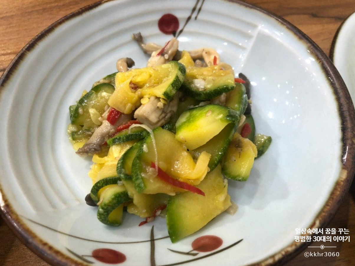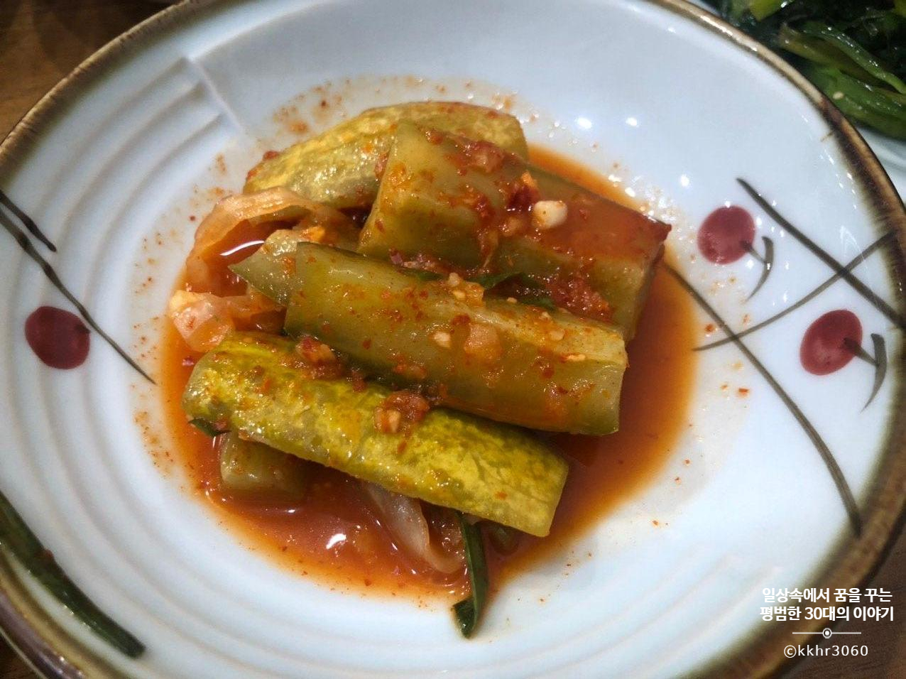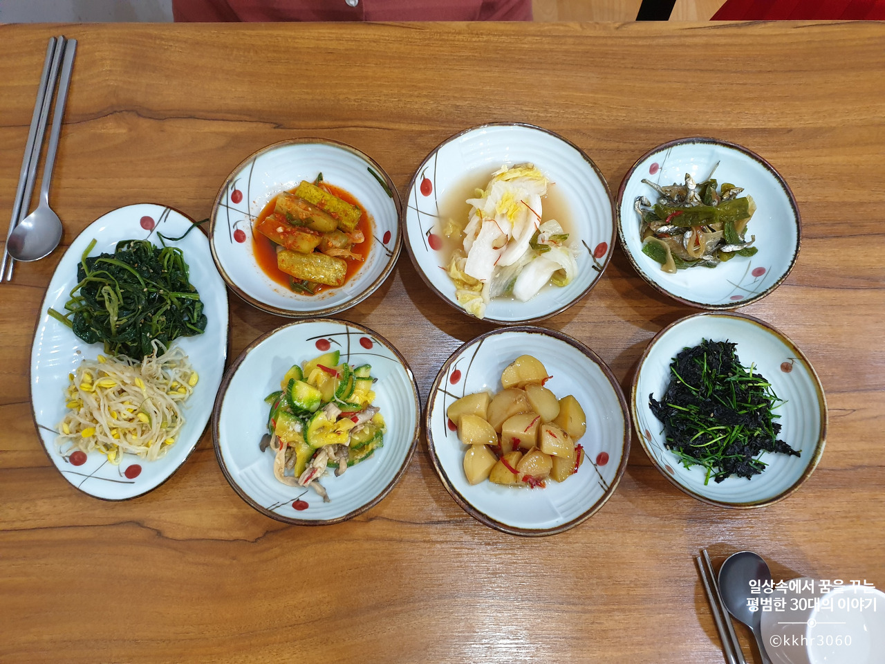주문을 하고 나면 반찬을 먼저 가져다주시는데 반찬 가짓수만 해도 8가지나 된다. 사장님께 여쭤보니 반찬의 종류는 그때그때 상황에 따라 달라진다고 한다. 우리는 저녁에 밥을 먹어도 반 공기씩만 먹는 습관이 있어 사장님께 공깃밥을 하나만 주셔도 될 것 같다고 하려고 했는데 반찬을 보고 생각이 바뀌어 그냥 오늘만큼은 1인 1공깃밥을 먹기로. 우리 둘 다 반찬을 많이 먹는 편이 아닌데 이 날은 진짜 많이 먹었다. 반찬이 하나하나 다 정갈하니 너무 맛있었다. 왜 반찬을 파시는지 알 것 같은 마음.