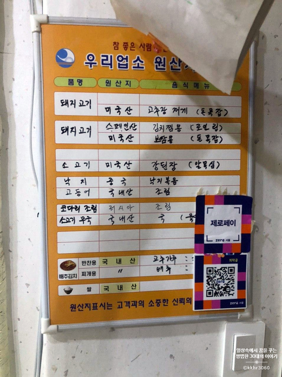오늘도 그냥 지나칠 수 없는 원산지 표시판. 대부분 국내산이 아닌 게 살짝 걸리긴 하지만 어쨌든 재료별로 원산지가 잘 기재되어 있어 마음은 놓였다.
