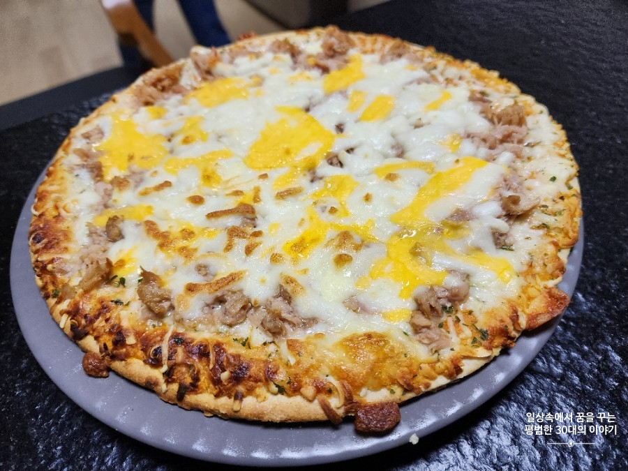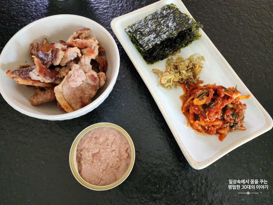 메뉴: 남편(참치피자), 나(점심에 먹고 남은 음식)