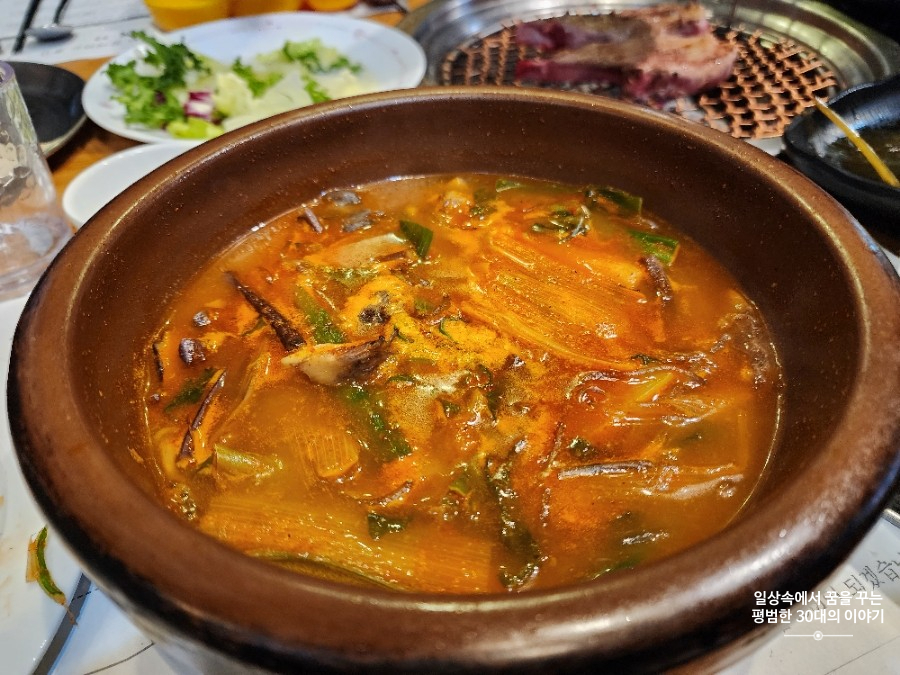 점심: 등갈비 김치찜, 멸치볶음, 청국장, 누룽지