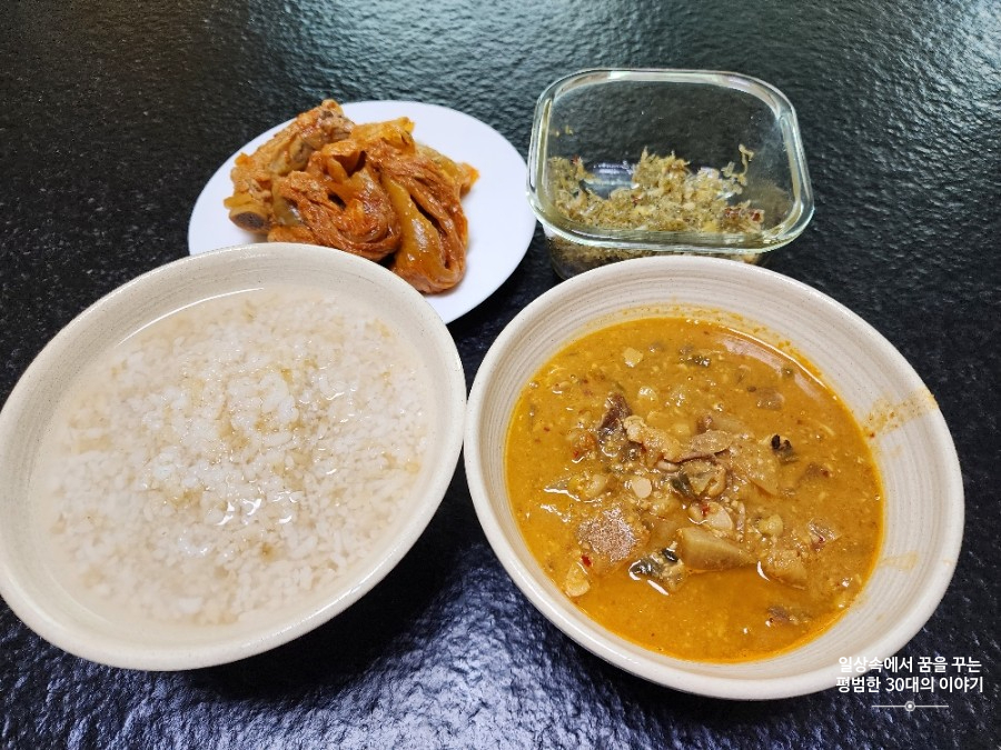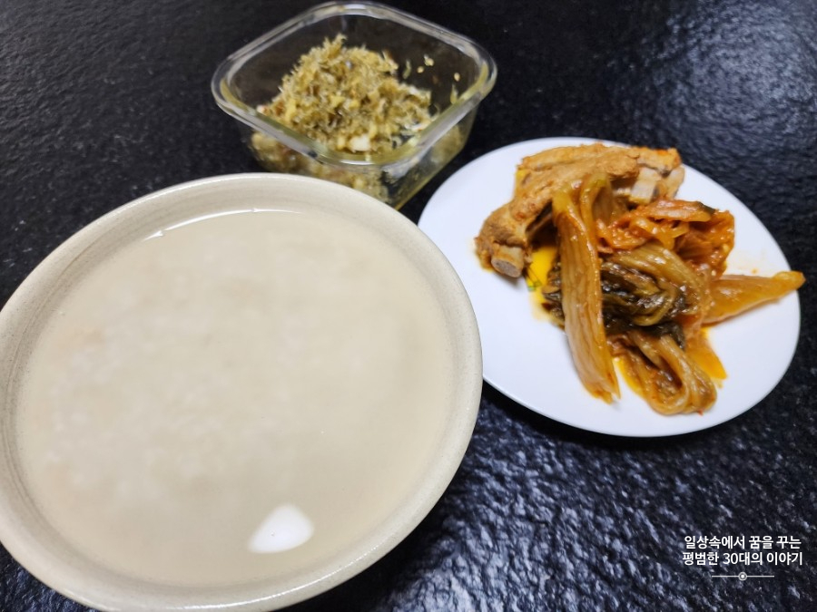 저녁: 나(등갈비 김치찜, 멸치볶음, 누룽지), 남편(참치 냉동피자) |