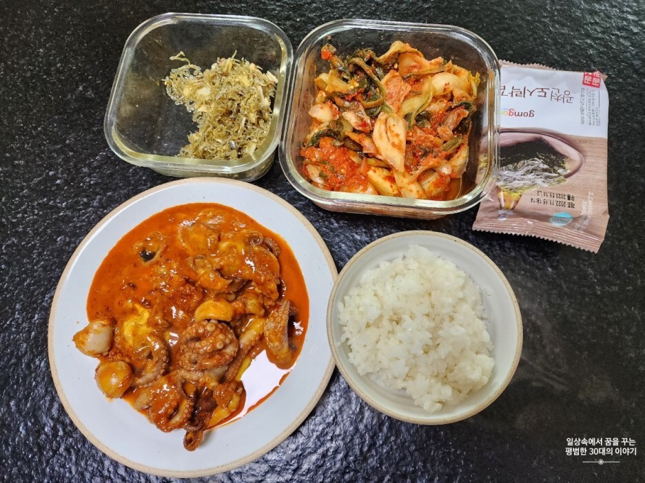 점심: 쭈꾸미볶음, 조미김, 멸치볶음, 김치
