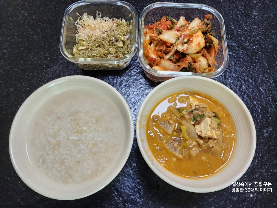 메뉴: 나(등갈비 김치찜, 멸치볶음, 누룽지), 남편(참치 냉동피자)